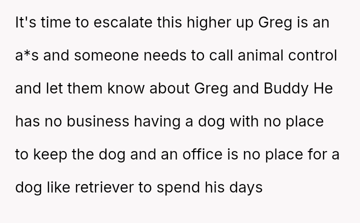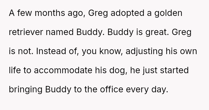 The conflict began when Greg adopted a golden retriever named Buddy and started bringing him to the office daily without managing the dog's behavior, leading to disruption.
