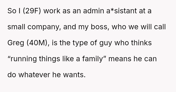 The narrator, a 29-year-old female administrative a*sistant, describes an escalating situation involving her boss, Greg (40M), who runs his small company with a self-proclaimed "family" mentality that allows him considerable lat*tude in his actions.
