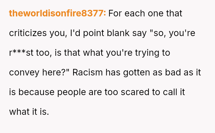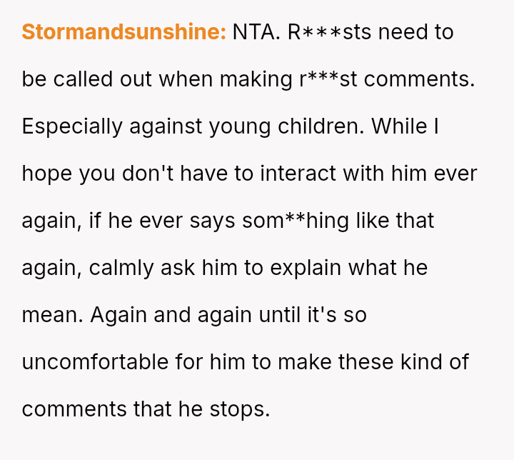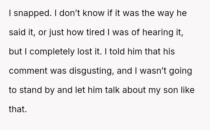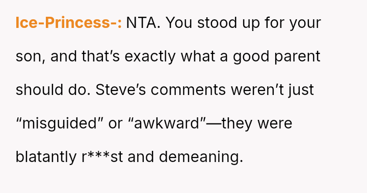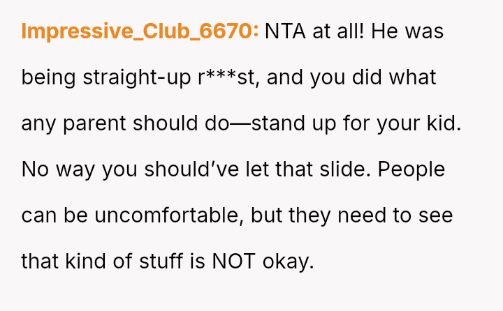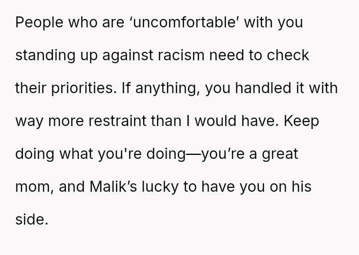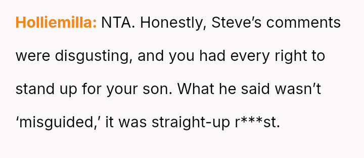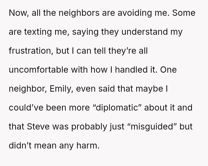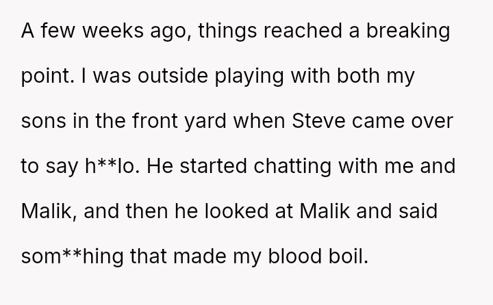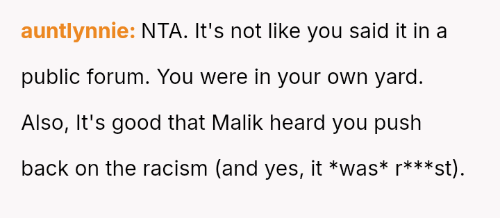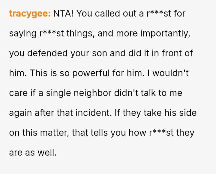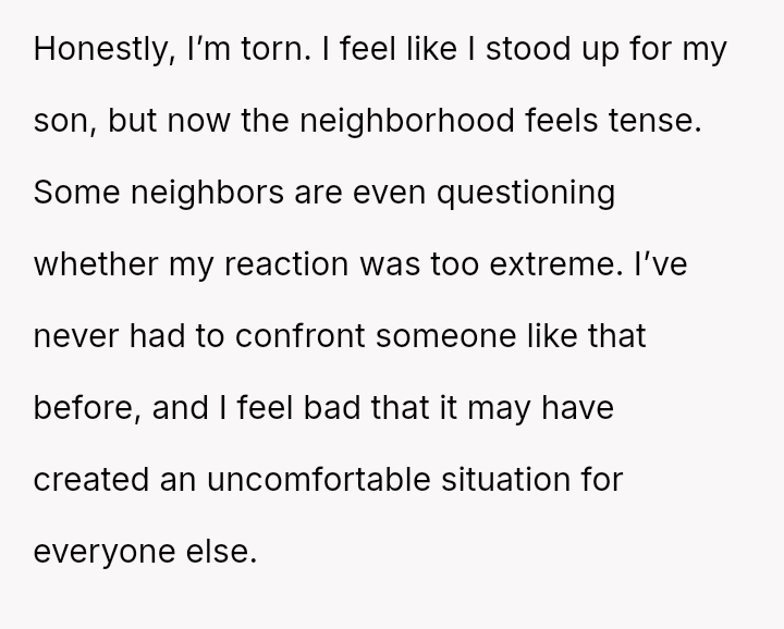 While she successfully defended her son against the offensive remarks, this action has resulted in social fallout, with neighbors suggesting her reaction was too extreme or impolite.