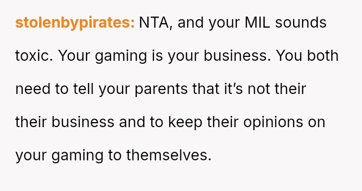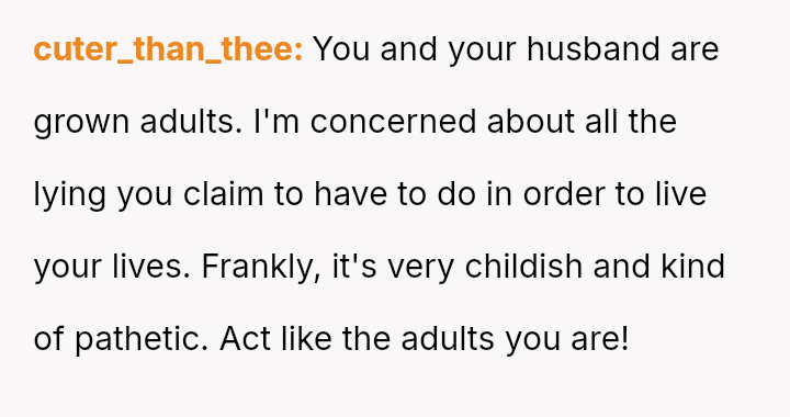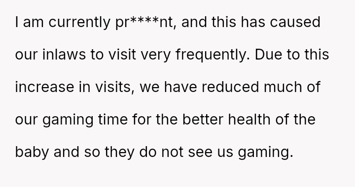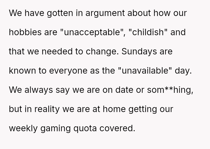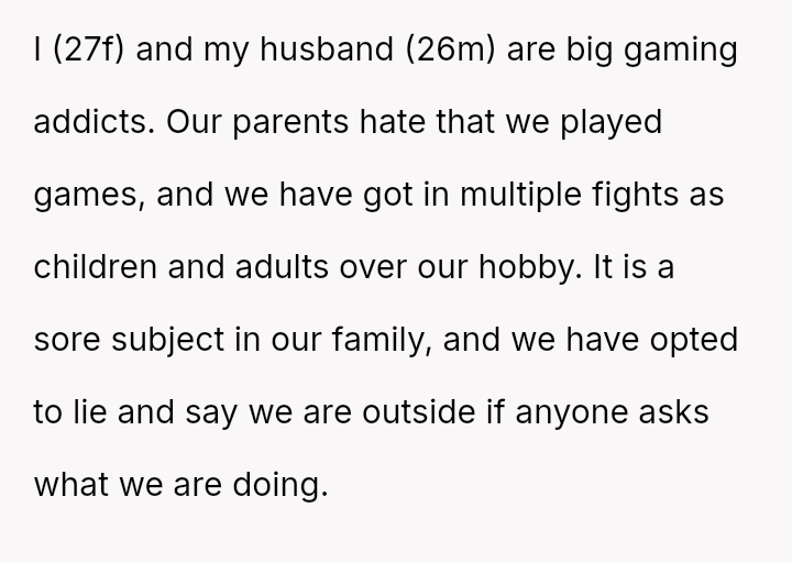 The original poster (OP) and her husband share a deeply ingrained hobby—gaming—that clashes significantly with their in-laws' expectations, leading the couple to maintain secrecy and engage in minor deception regarding their Sunday activities.