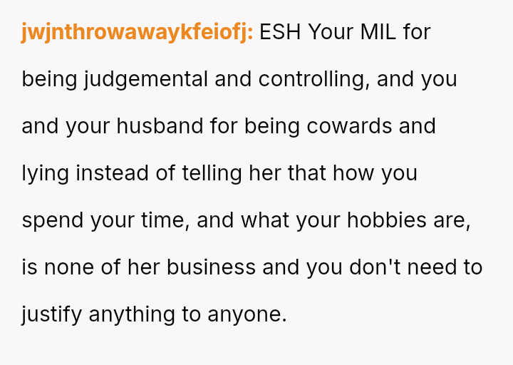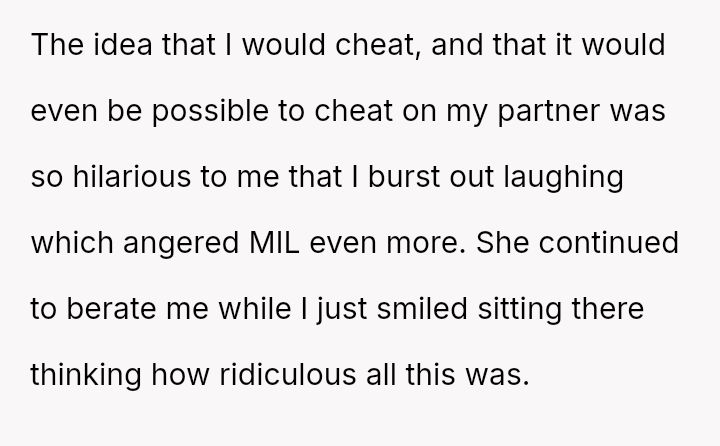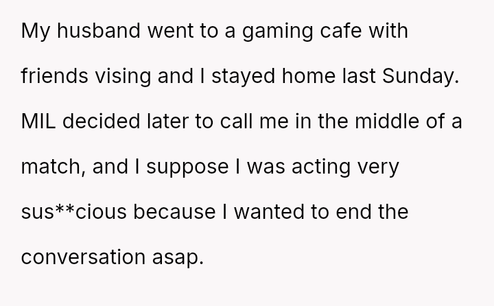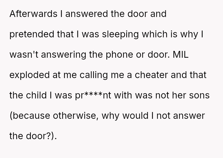 Given that the OP maintained a long-standing habit of lying about their Sunday activities to avoid criticism, was the MIL justified in her extreme accusations of cheating based on the OP's sus**cious behavior during a phone call and subsequent avoidance of the door?
