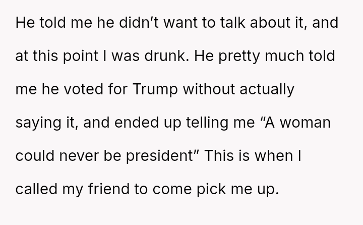The original poster (OP) felt immediate discomfort and recognized severe ideological differences with their date, leading them to abruptly leave the situation when faced with misogynistic comments.