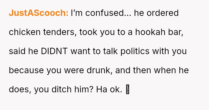 Considering the clear clash of fundamental beliefs and the OP's swift exit when feeling unsafe or offended, the question remains: Is it acceptable to abandon a date immediately upon encountering deeply opposing or offensive views, or does social etiquette require a more formal explanation or attempt at resolution, even when intoxicated?
