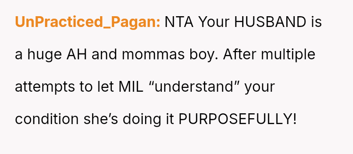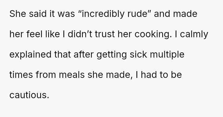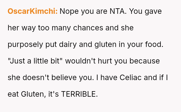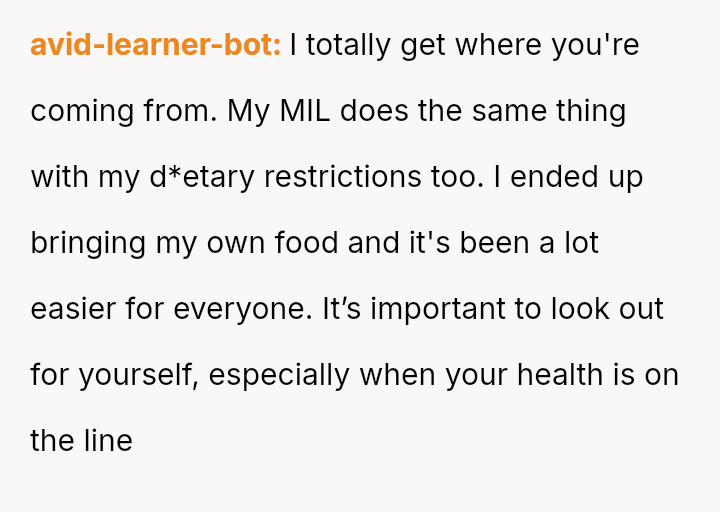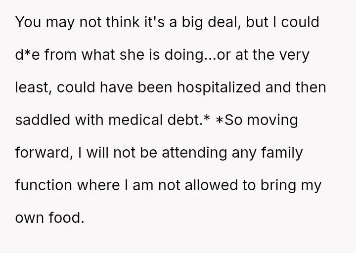 The original poster (OP) found herself in a difficult situation where her serious medical needs clashed directly with her mother-in-law's insistence on controlling the food provided at family gatherings.