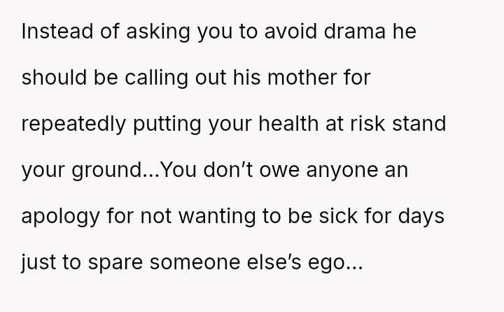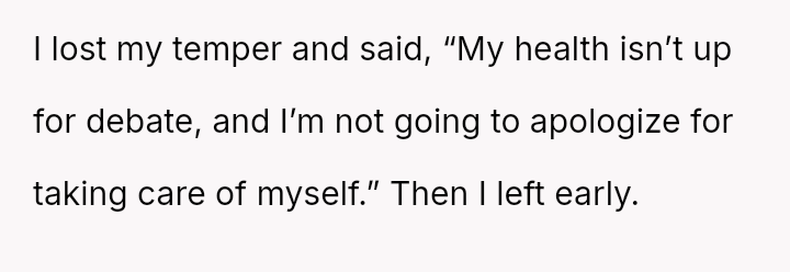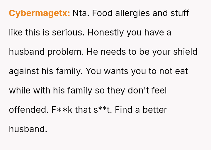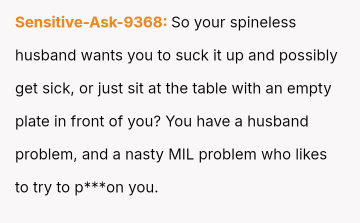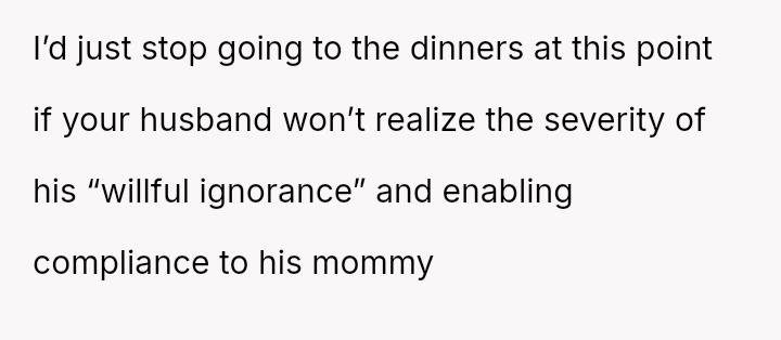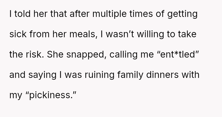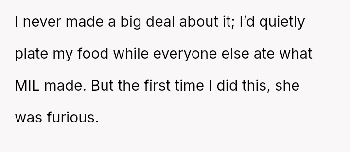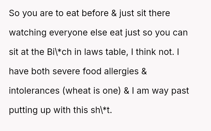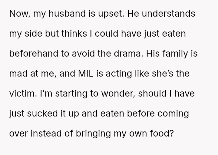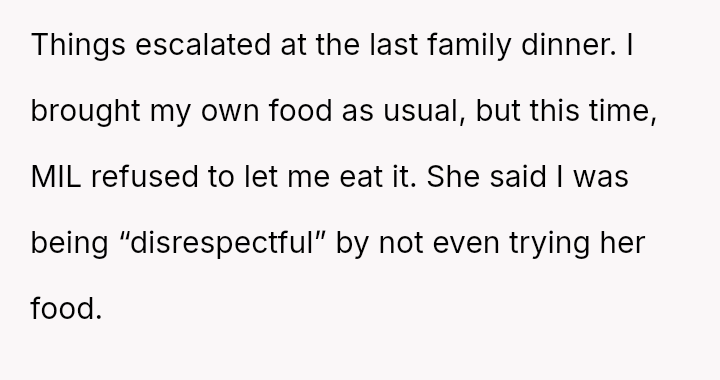 Given the history of illness and the MIL's refusal to respect stated d*etary requirements, was the OP justified in setting a firm boundary by refusing to eat the provided food and leaving the dinner early, or was her husband correct that she should have managed the situation privately by eating beforehand to maintain family harmony?