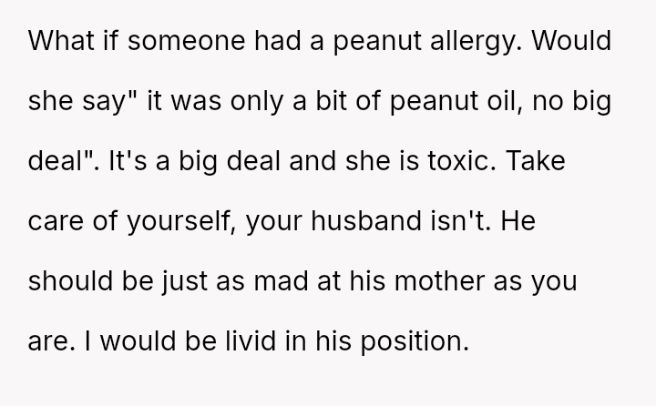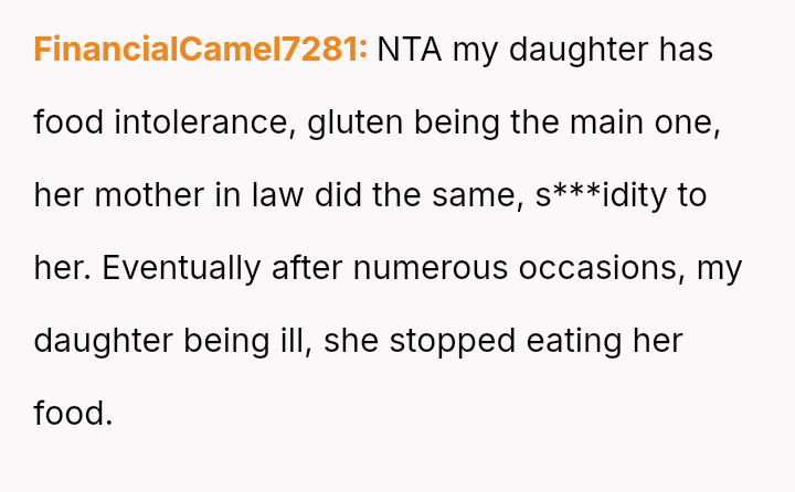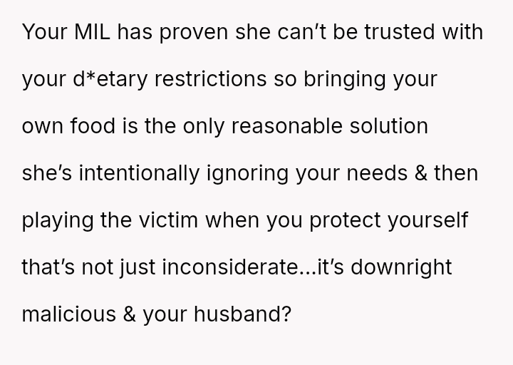 Despite repeated clear warnings and verifiable negative health consequences from consuming ingred*ents she is intolerant to, the MIL repeatedly failed to accommodate these needs, leading the OP to prioritize her health by bringing her own safe meals.