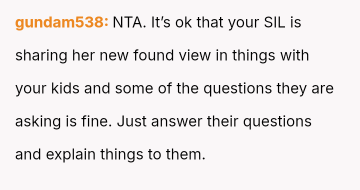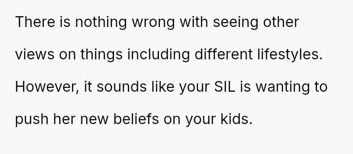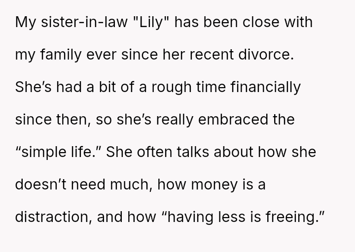 The original poster (OP) is struggling with a conflict where their sister-in-law's strong anti-materialistic stance is influencing the OP's children to question their family's comfortable lifestyle.