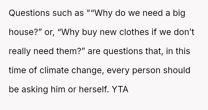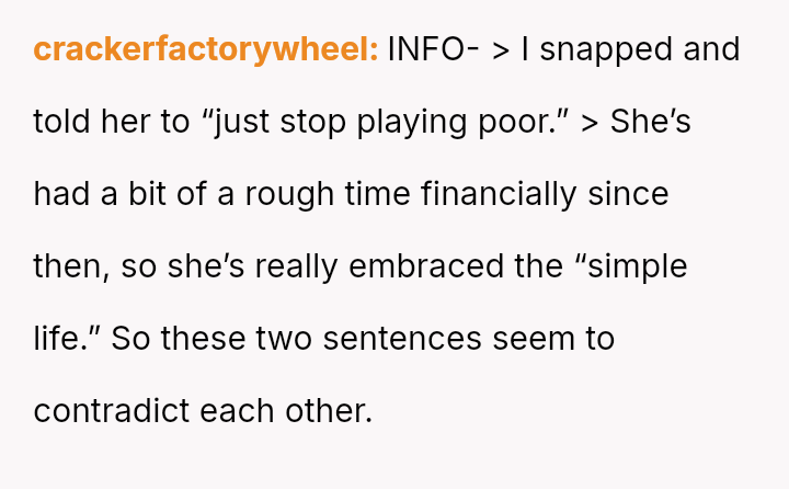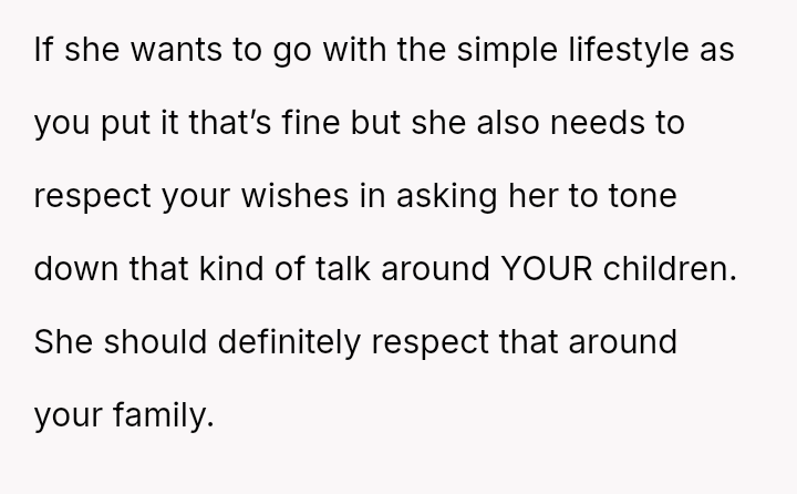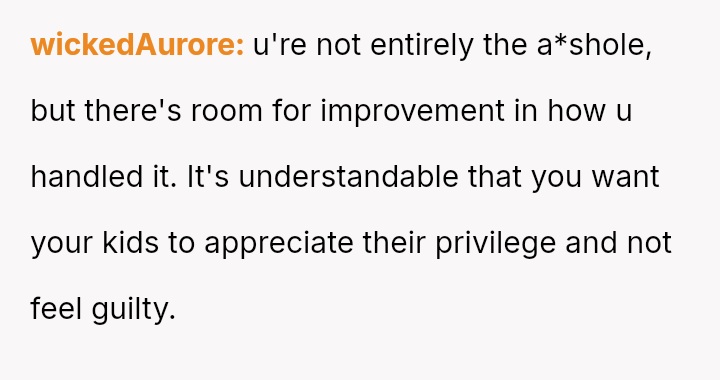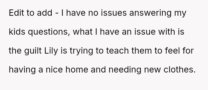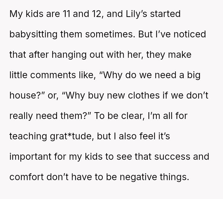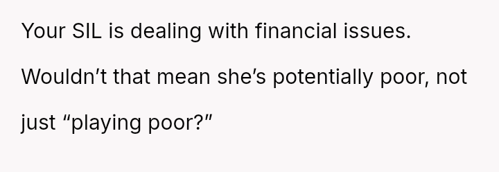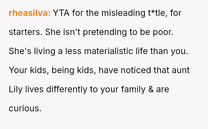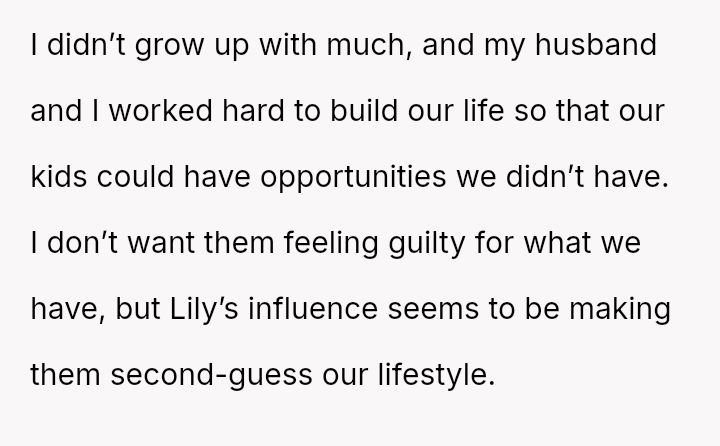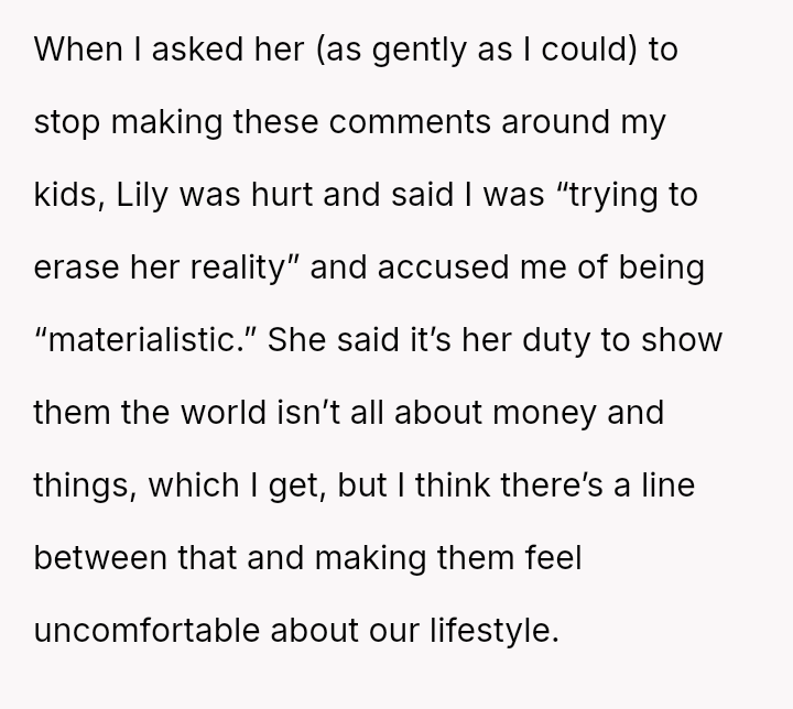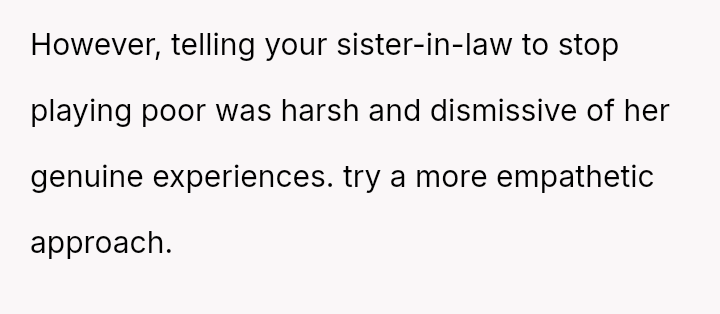The OP feels the need to defend their hard-earned success and prevent feelings of guilt in their children, leading to an argument where the OP told the sister-in-law to stop 'playing poor.' Is the OP justified in setting boundaries to protect their children's perception of their own life, or is the sister-in-law correct that she is simply sharing valid, contrasting life values, making the OP overly sensitive to differing viewpoints? Where is the appropriate line drawn between teaching grat*tude and instilling guilt?