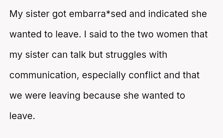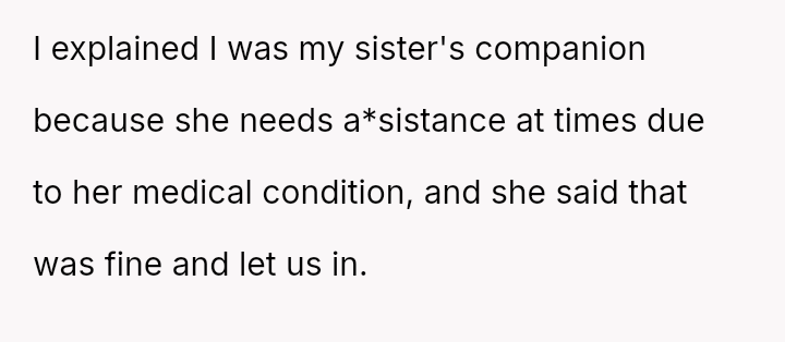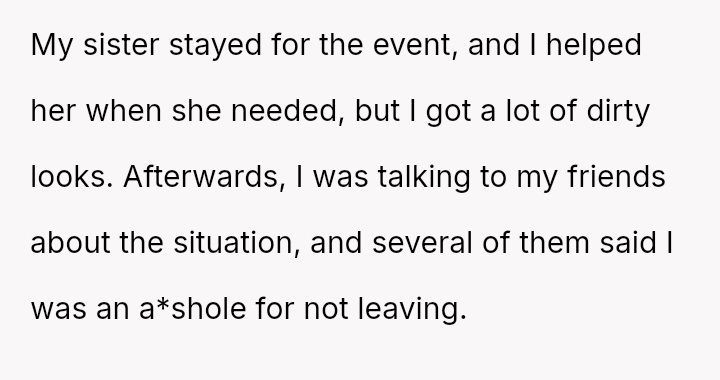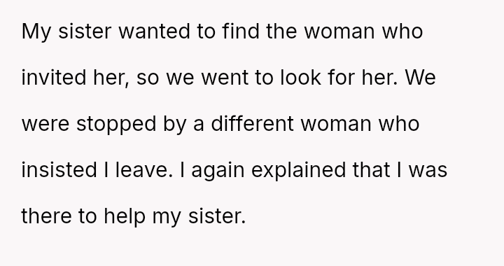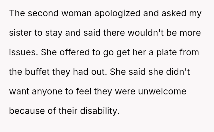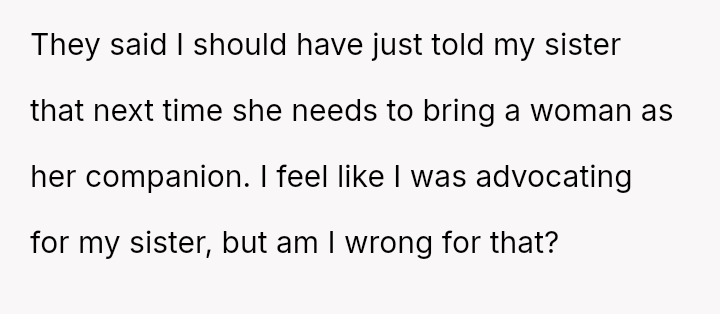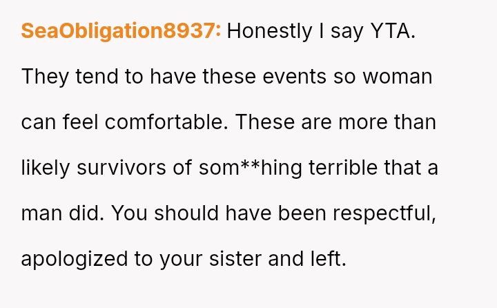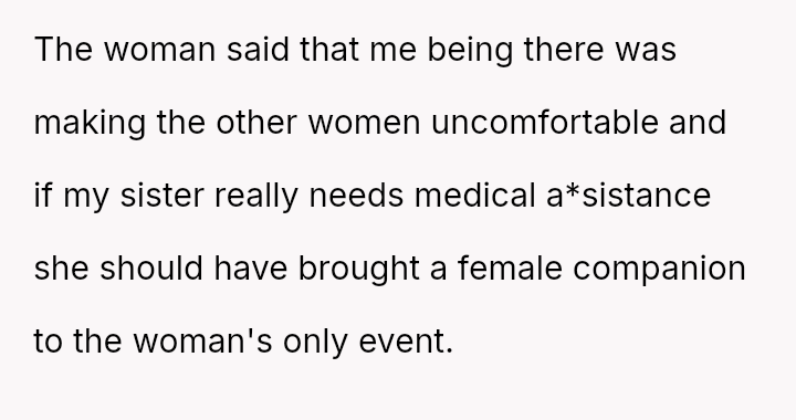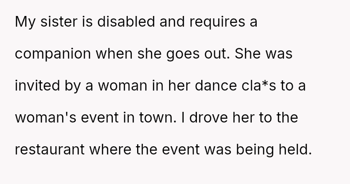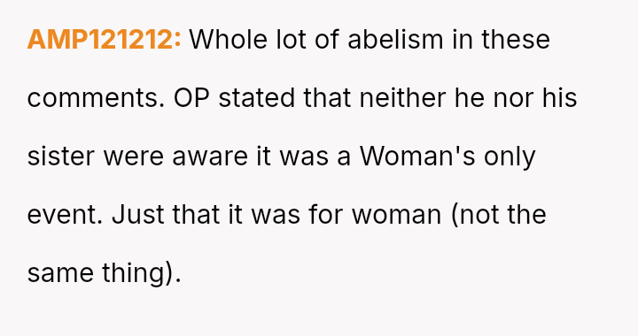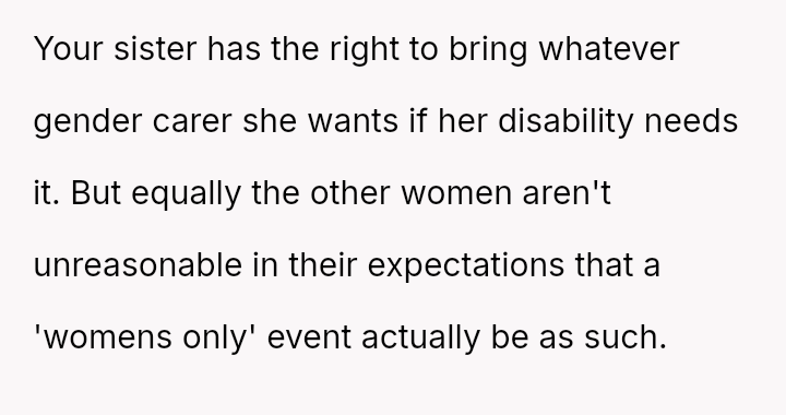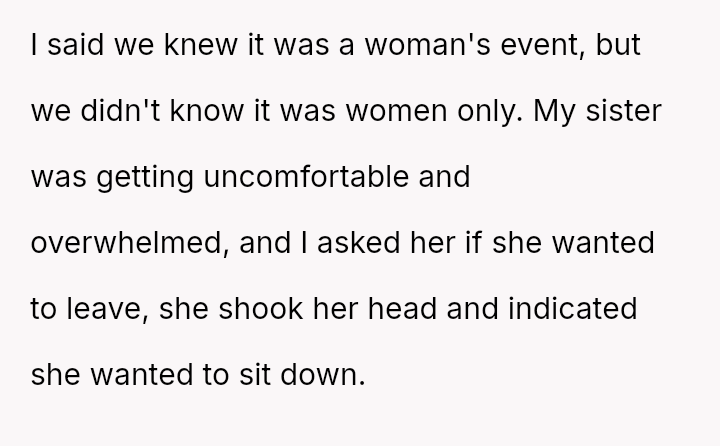 The original poster (OP) acted as an advocate for their disabled sister, insisting on remaining at the event to provide necessary support, which directly conflicted with the expectations of some attendees who felt the OP's presence v***ated the 'women's only' rule and caused discomfort.