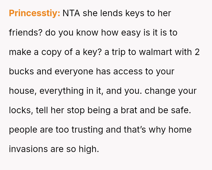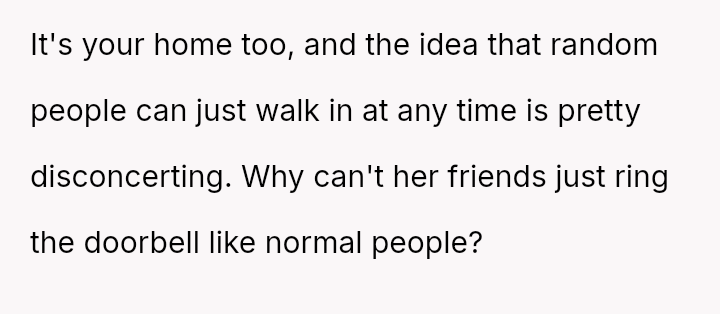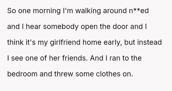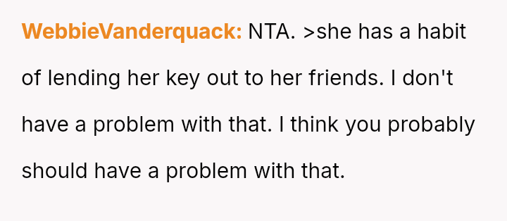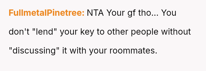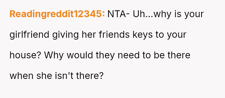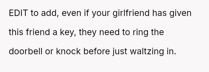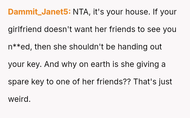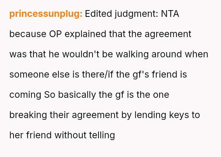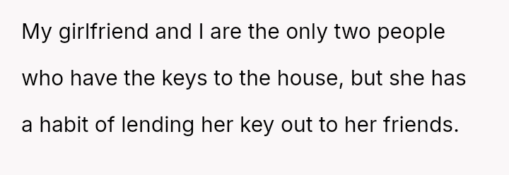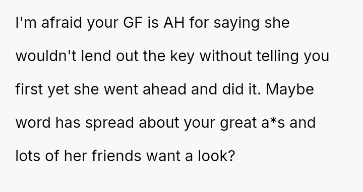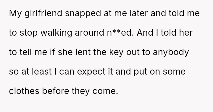 Given that the house is a shared space where both parties have guests, must the girlfriend provide advance notice about lending keys, or is the OP solely responsible for a*suming that guests might arrive unexpectedly and covering up?