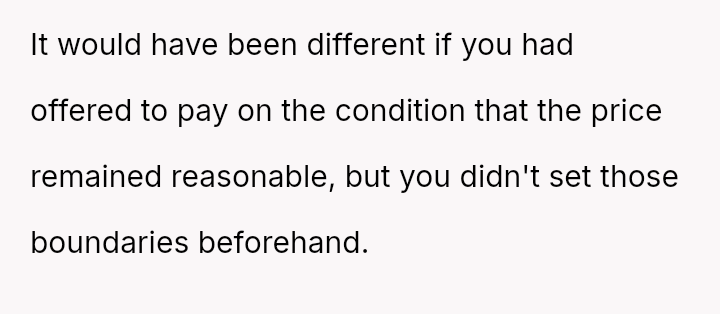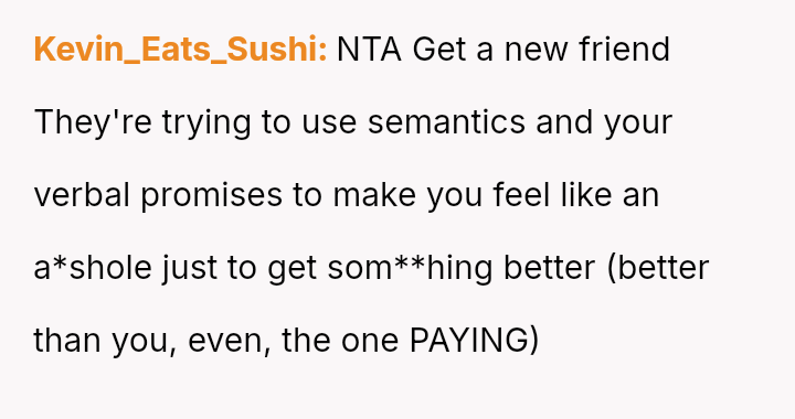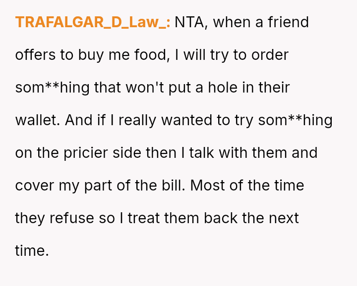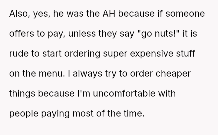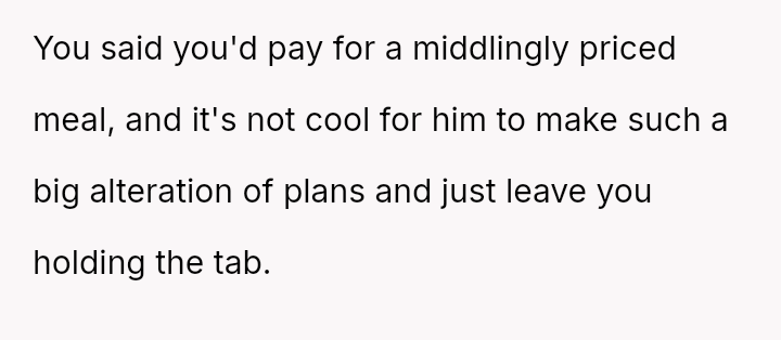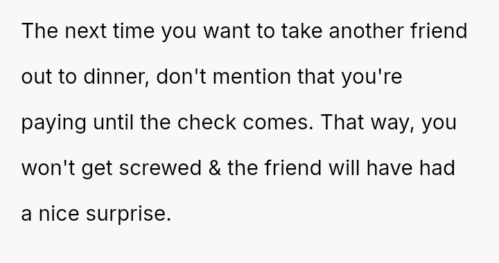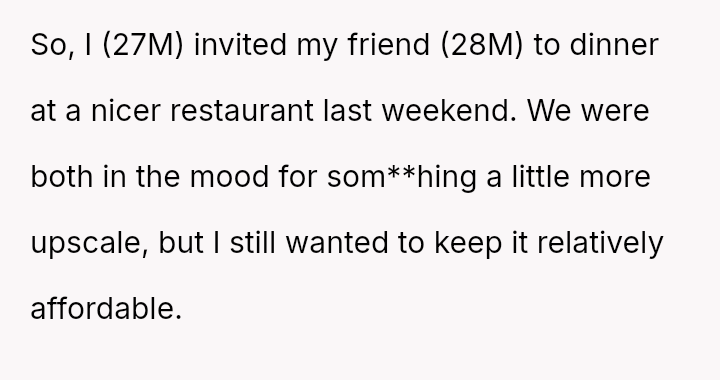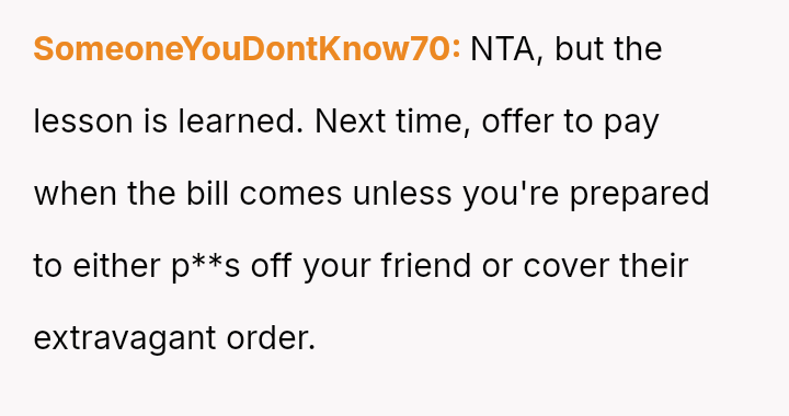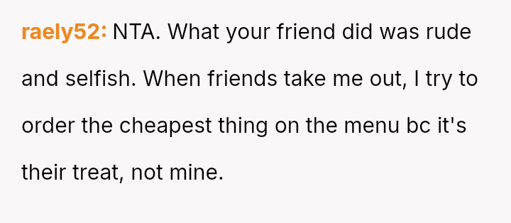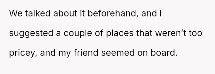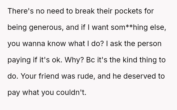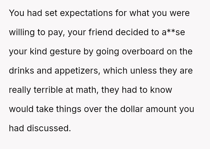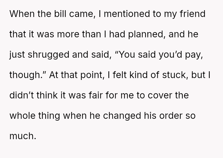 The original poster felt taken advantage of when their friend significantly upgraded the meal cost after agreeing to a budget, leading to a direct confrontation over who should pay the unexpectedly high bill.