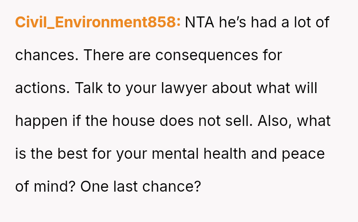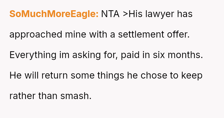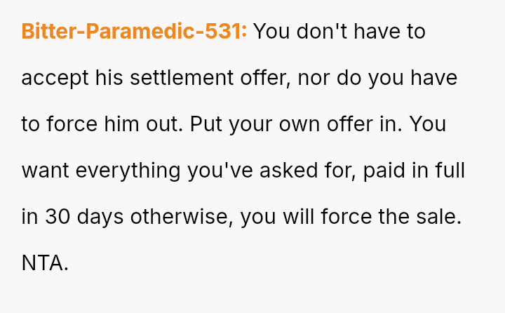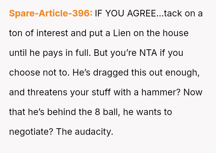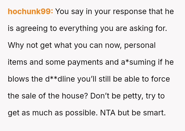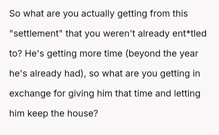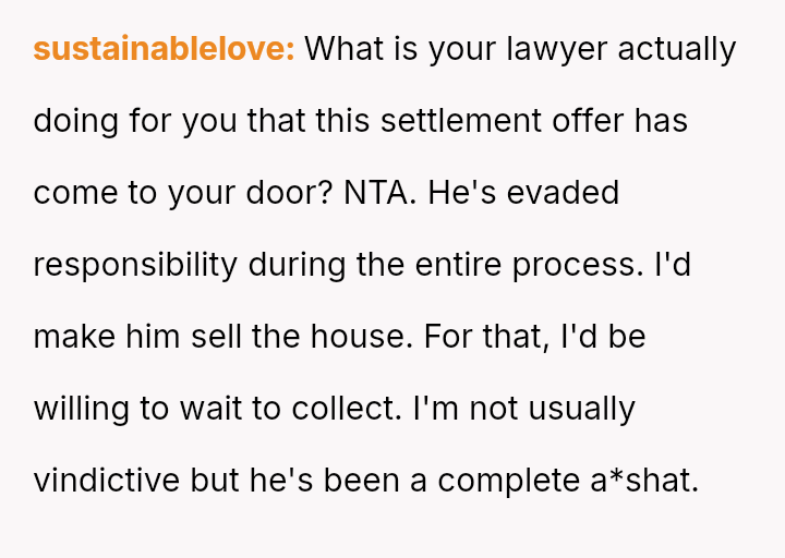 Given the ex-husband's history of legal evasion and intentional property destruction, should the OP prioritize immediate, legally enforceable security by accepting the settlement offer, or should she reject it to pursue the harsher consequence of forcing the sale of the house, even if it delays her final payment?