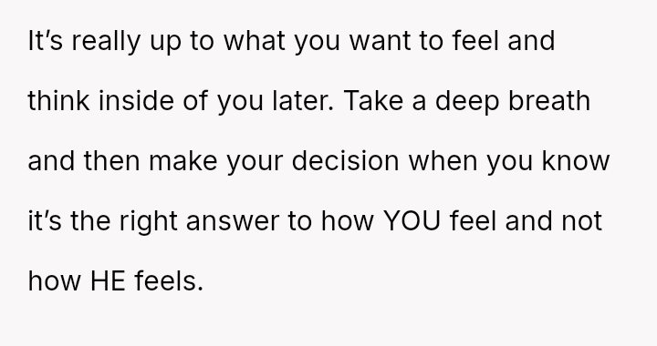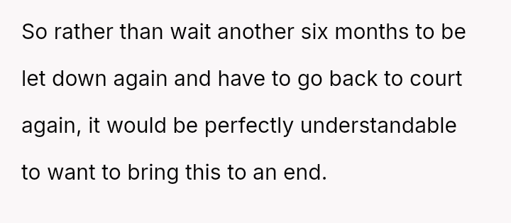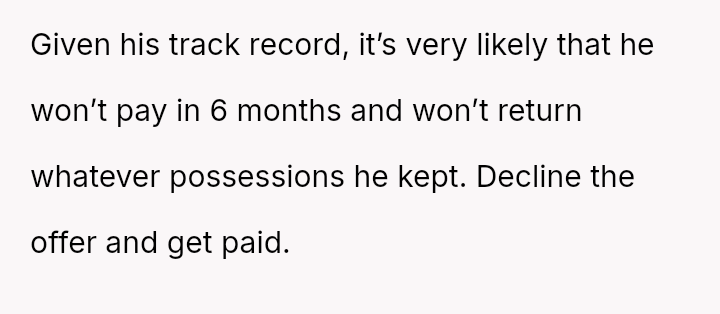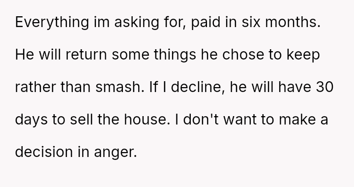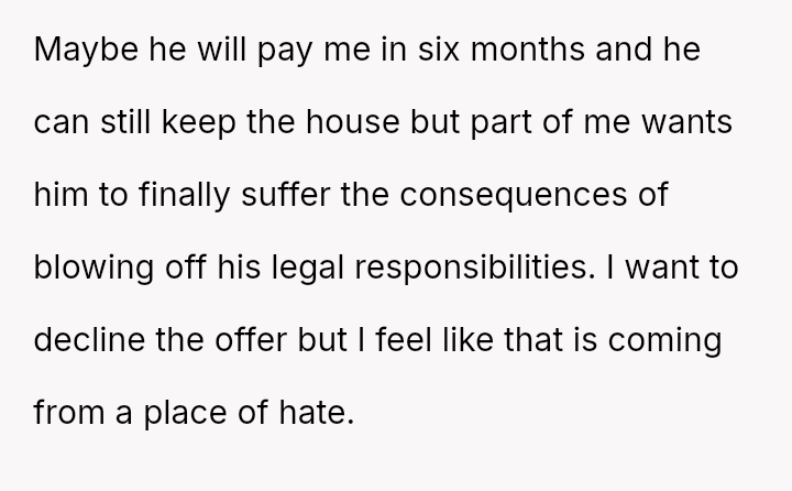 She acknowledges that accepting the six-month payment plan might satisfy her financial need but worries that declining it is motivated by animosity rather than practical necessity.