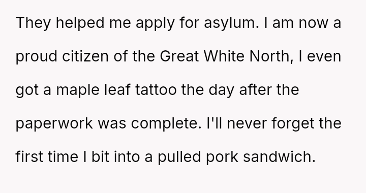 The taste of her first pulled pork sandwich in Canada was more than a meal—it was the bittersweet flavor of liberation, a symbol of a new life carved out by courage and resilience.
