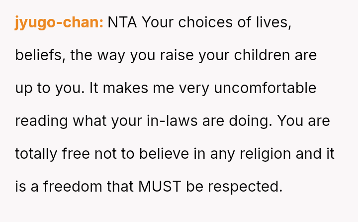 The central conflict lies between the OP's deeply held values concerning personal freedom and their past experience of oppression, versus the in-laws' desire to impose their cultural and religious expectations on the grandchildren, creating a significant breach of es**blished family boundaries.