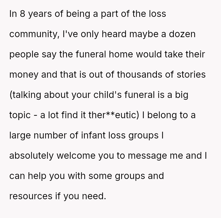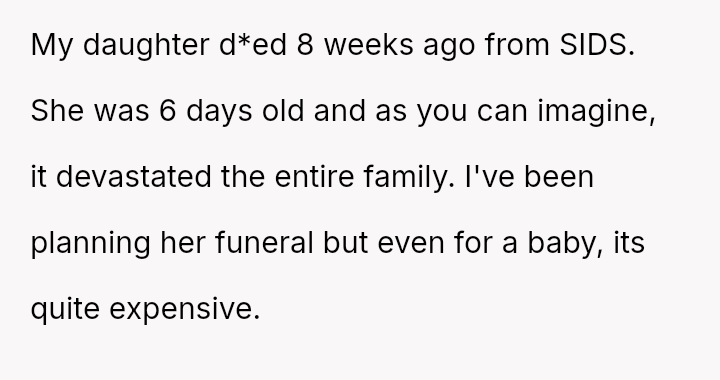 The original poster (OP) is experiencing profound grief following the sudden death of their infant daughter and is attempting to arrange a fitting funeral while managing significant financial stress.