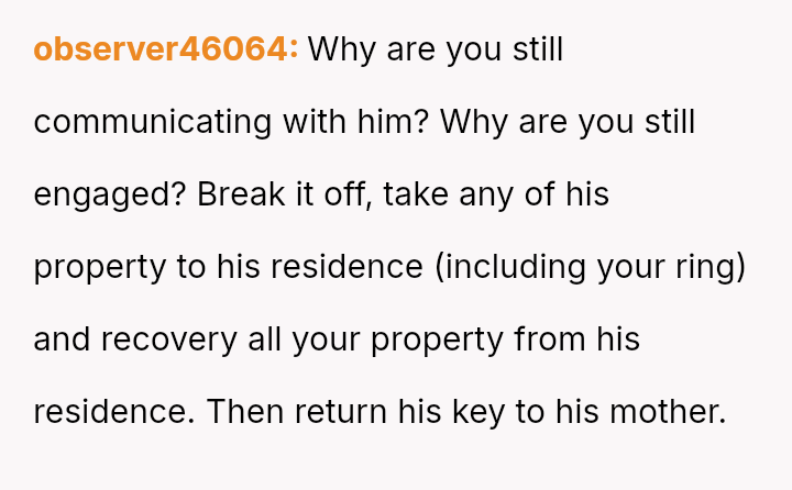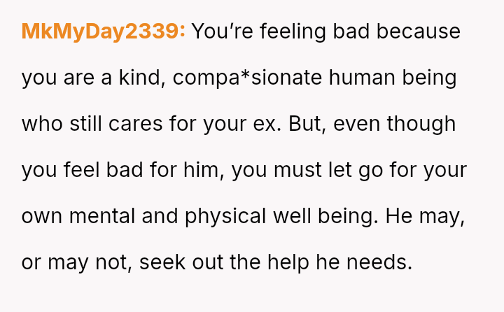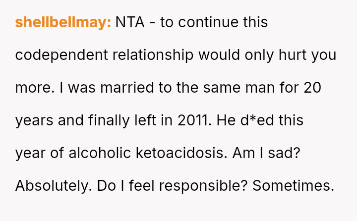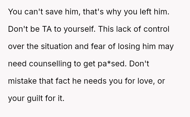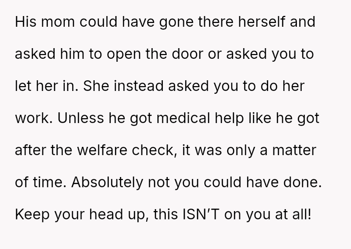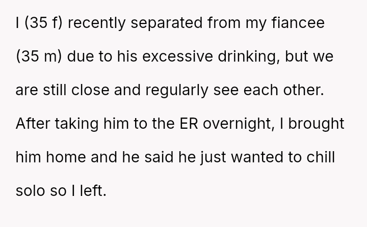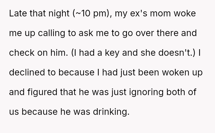 The original poster is grappling with intense guilt after refusing to check on their recently separated, heavily drinking ex-fiancen and subsequently leading to his mother calling for a welfare check.