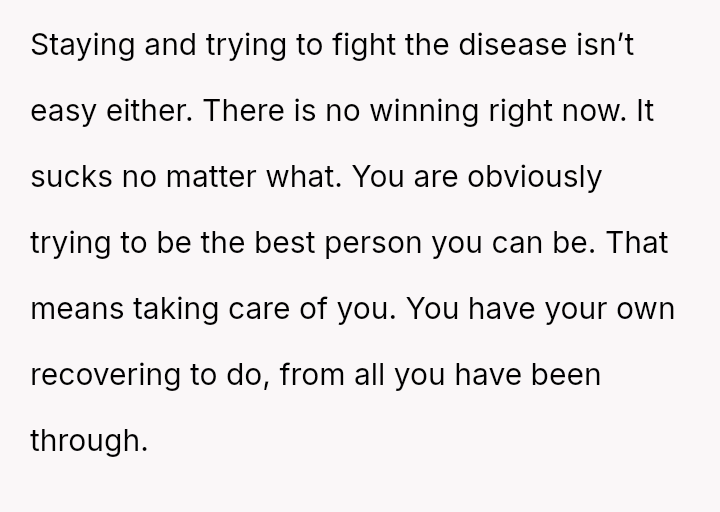 The core conflict lies between the poster's understandable burnout, need for personal boundaries after caregiving fatigue, and the severe, life-threatening outcome of their ex-fiancen's condition.
