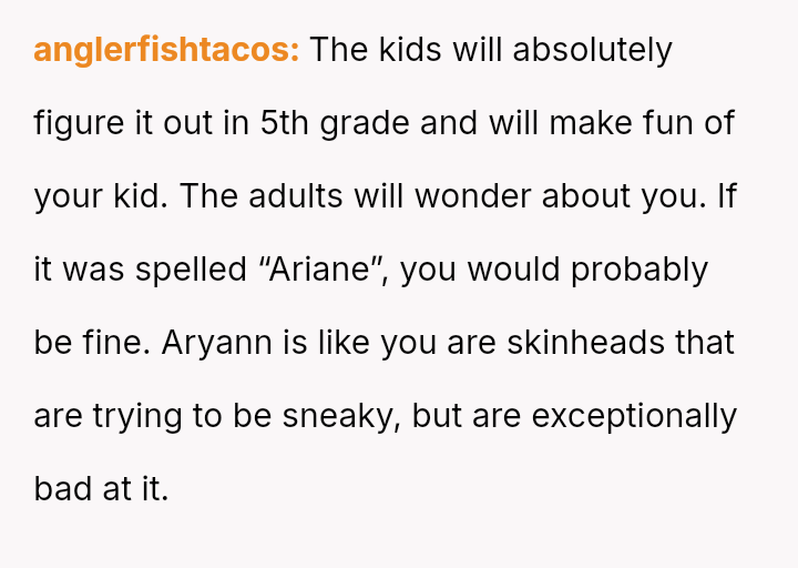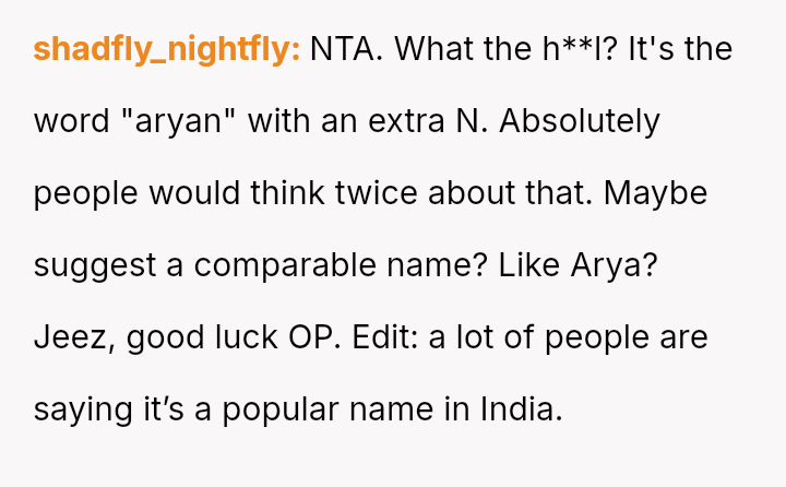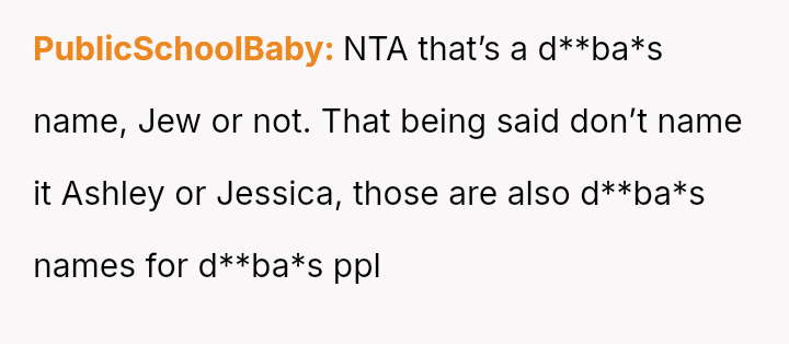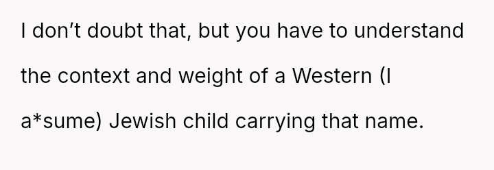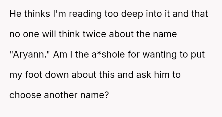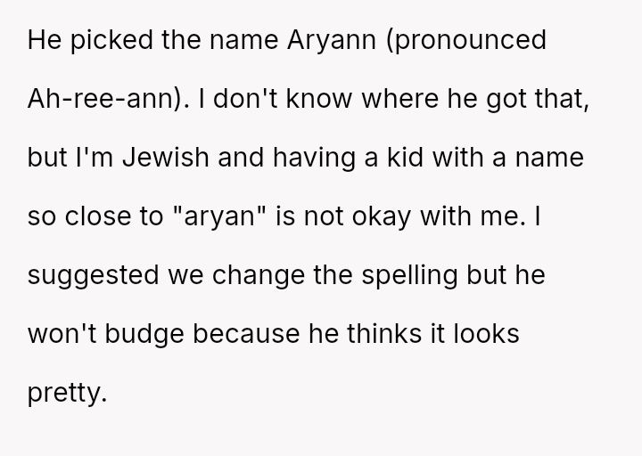 The original poster (OP) experienced significant distress and alarm upon learning the name her husband selected, Aryann, carried strong historical connotations that deeply conflicted with her Jewish ident*ty.