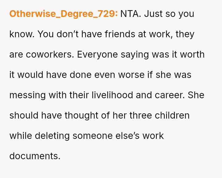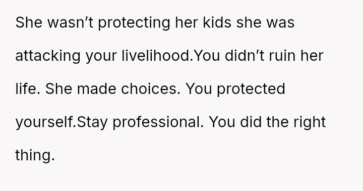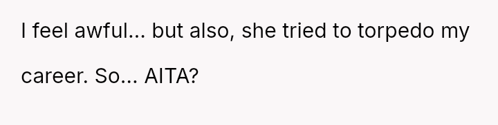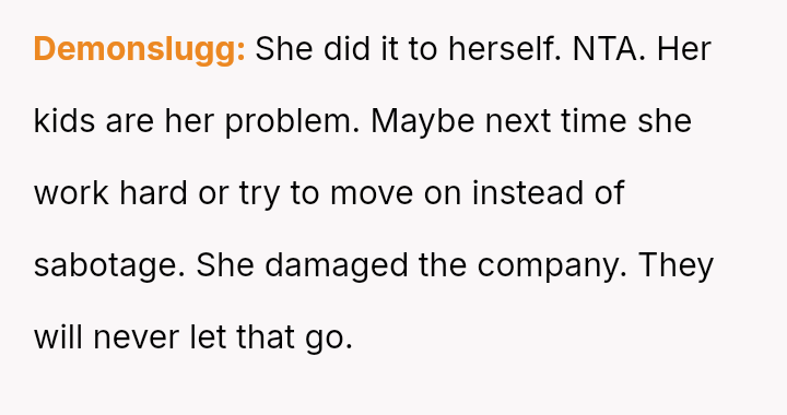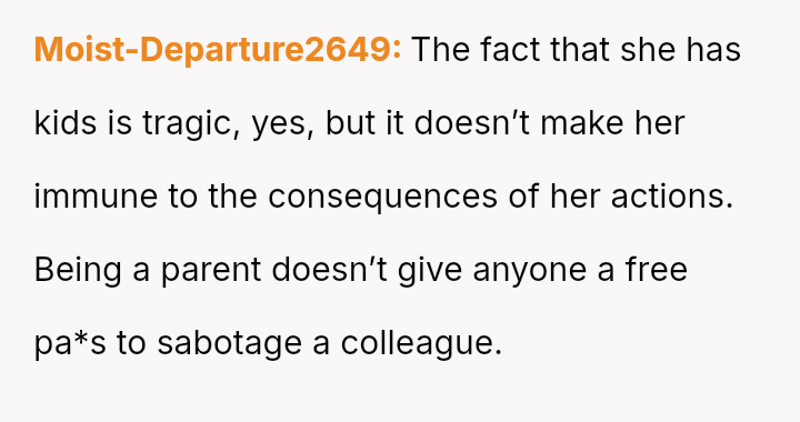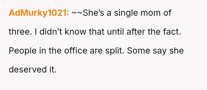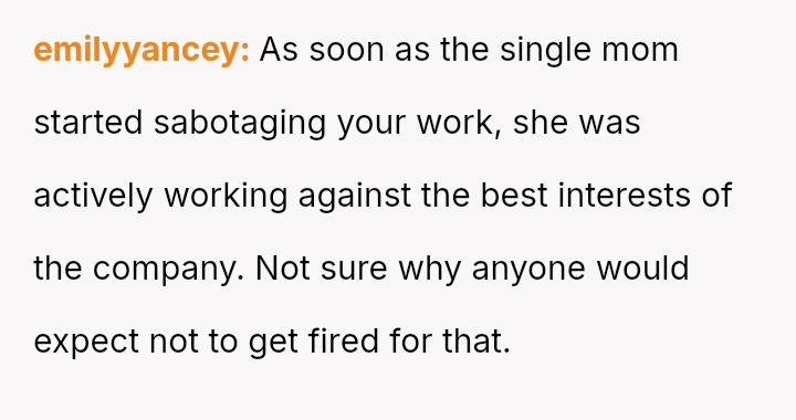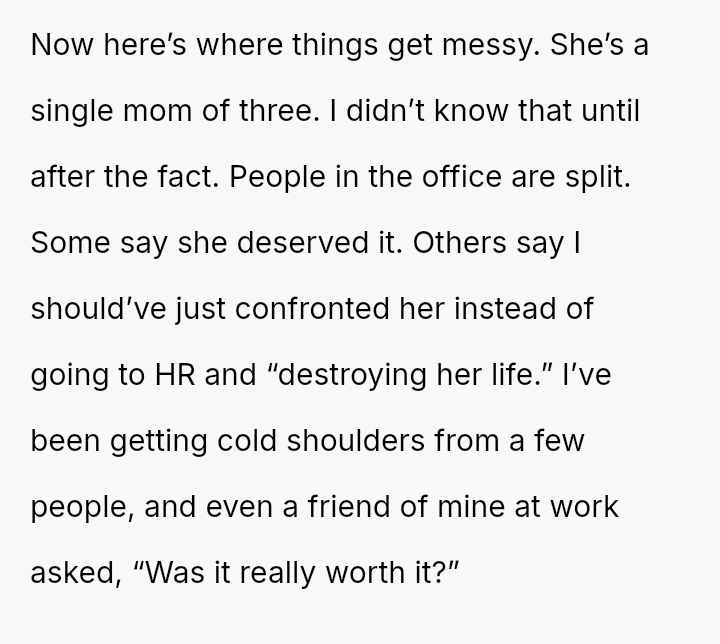 While the OP acted to protect their professional standing against malicious career interference, the knowledge that the terminated coworker is a single mother has introduced significant guilt and external judgment regarding the severity of the consequence.