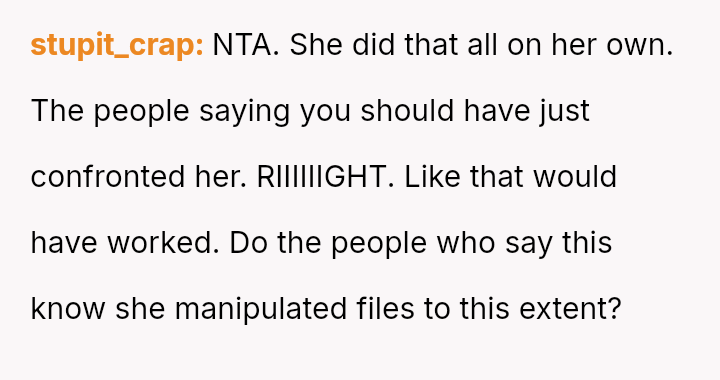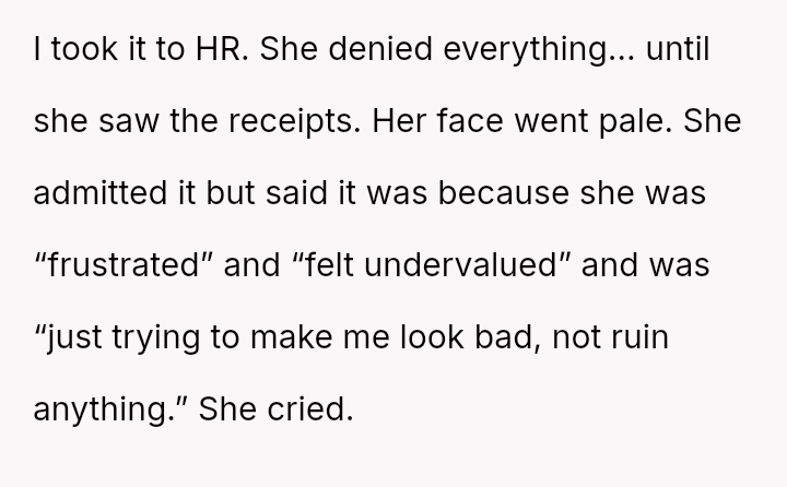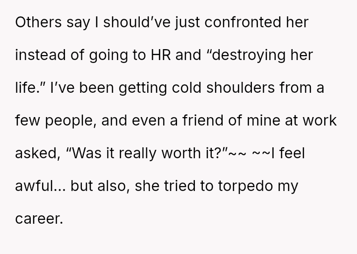 Given that the coworker engaged in deliberate, documented attempts to undermine the OP's job performance, was the OP correct in escalating the matter directly to Human Resources, or would a direct, private confrontation have been a more ethical first step, balancing professional protection against personal empathy?