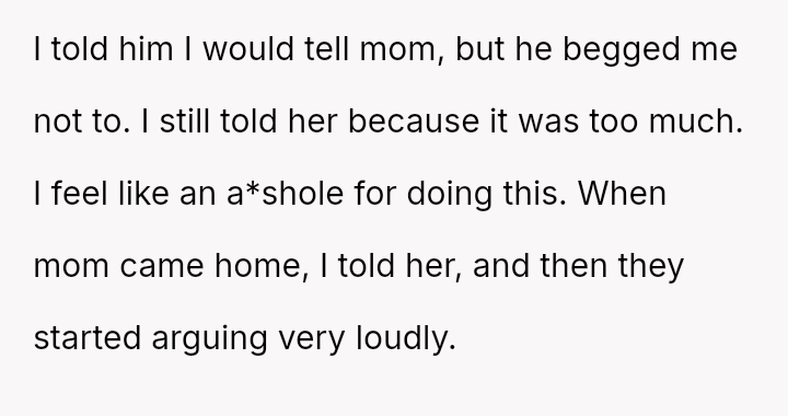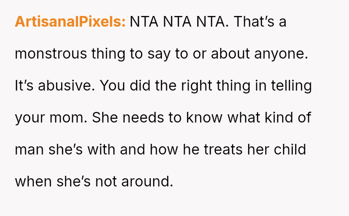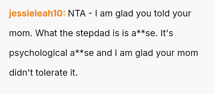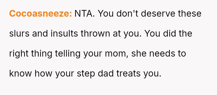 Given the severe nature of the stepfather's comment and the resulting marital distress, the central question becomes: Does the OP have a primary responsibility to protect their own emotional well-being from verbal a**se, or does their responsibility to maintain family peace outweigh the need to disclose harmful behavior to their mother?