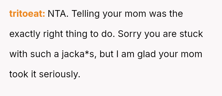 The core tension lies between the OP's justifiable reaction to a**se and the subsequent guilt felt over reporting the stepfather's words, which fractured the marital dynamic.