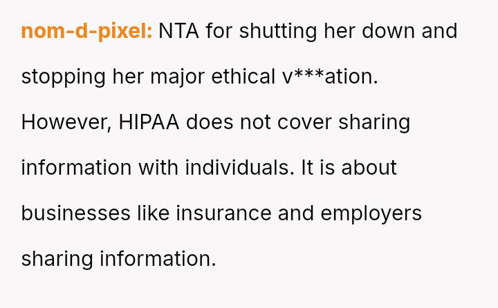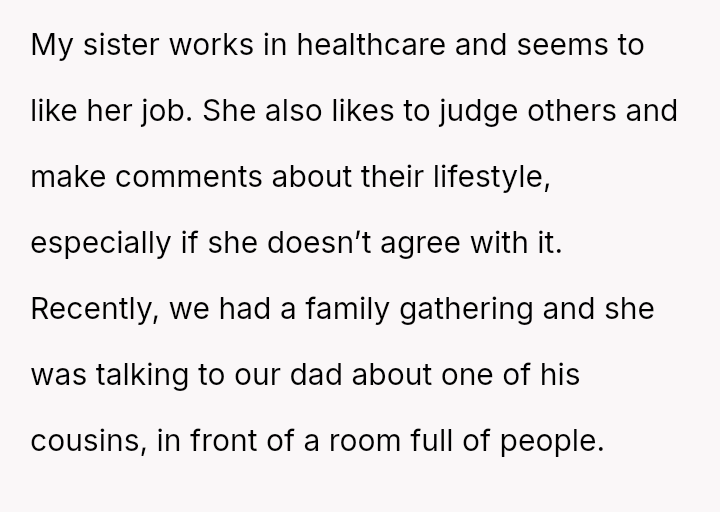 The original poster (OP) felt compelled to publicly confront their sister over sharing private medical information at a family gathering, viewing it as a necessary step against her judgmental behavior and a perceived v***ation of patient confidentiality rules.