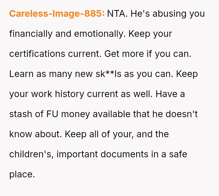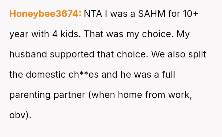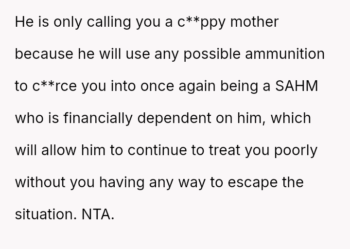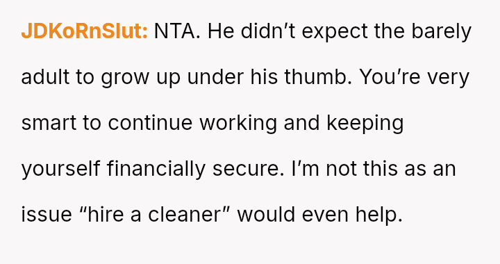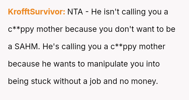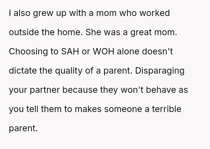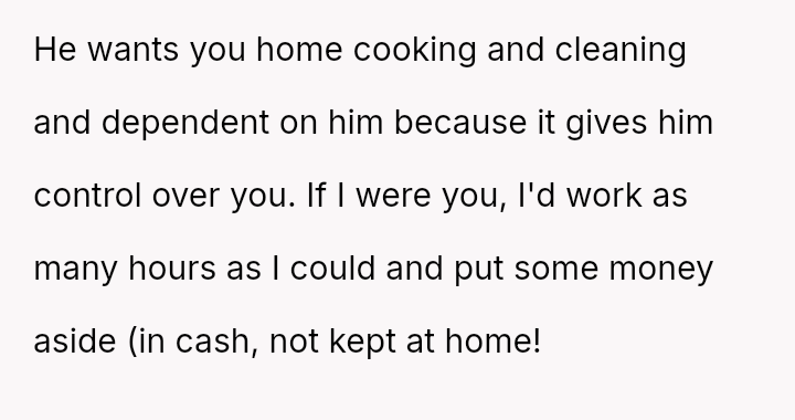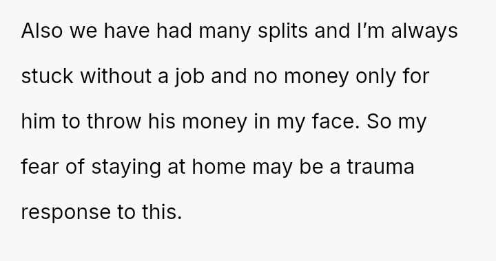 Is the OP justified in prioritizing her mental health and career aspirations over her husband's desire for a traditional home structure, especially given her past trauma regarding financial dependency, or is the husband’s expectation that she fulfill the role of a full-time homemaker reasonable within the context of their marriage?