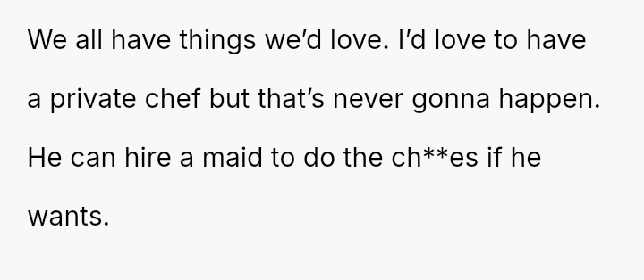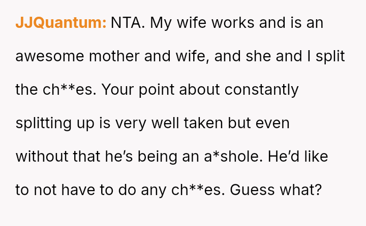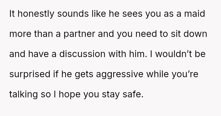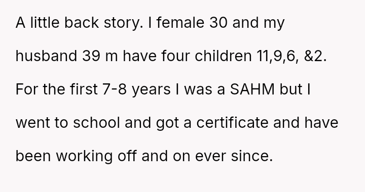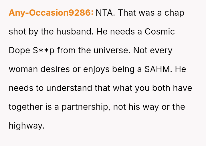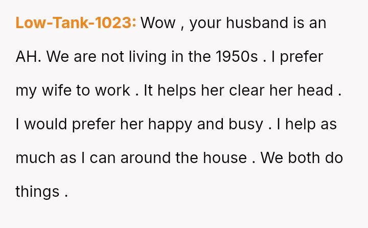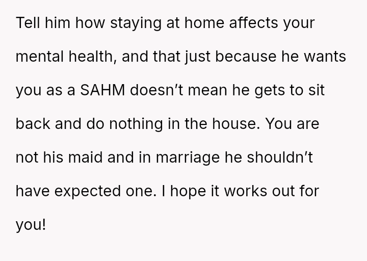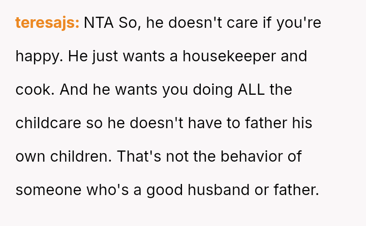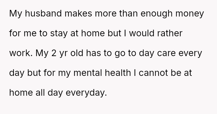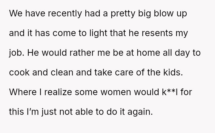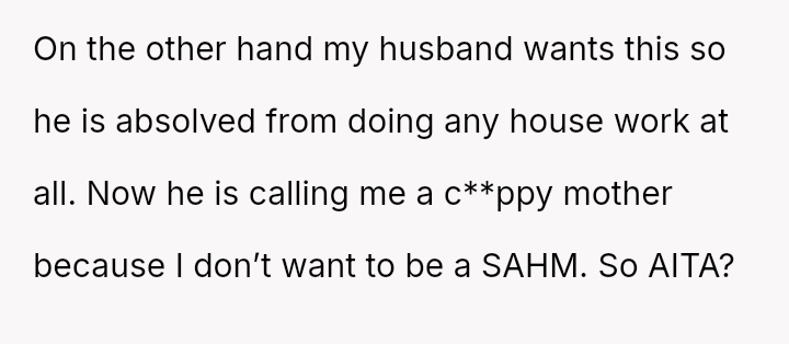 The original poster (OP) faces a significant conflict where her desire for personal fulfillment through work clashes directly with her husband's expectation that she should be a stay-at-home mother responsible for all domestic duties.