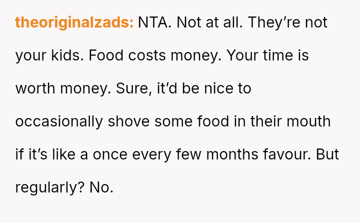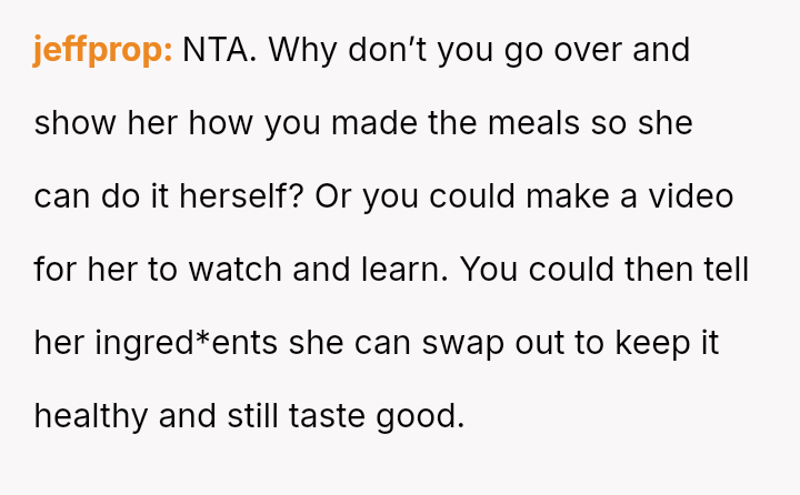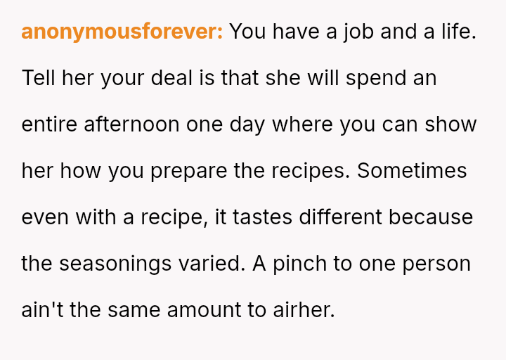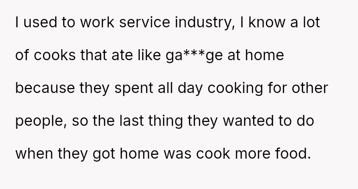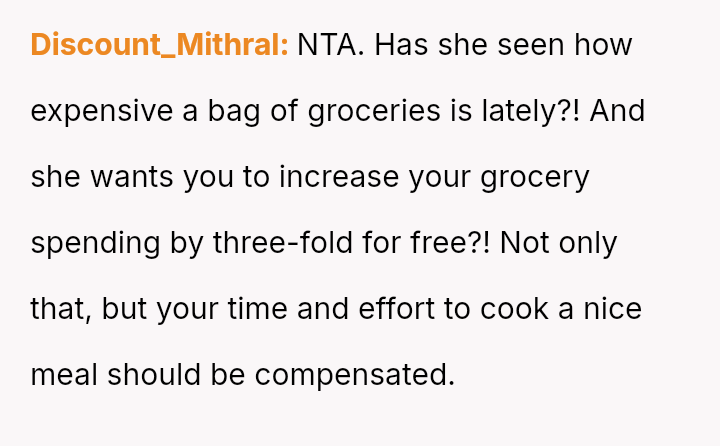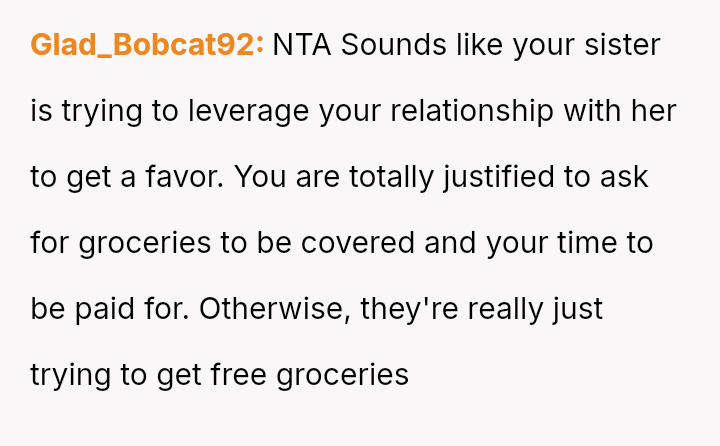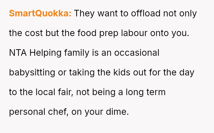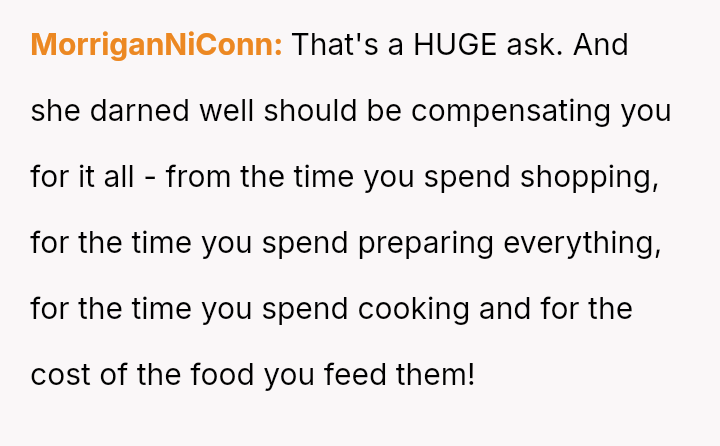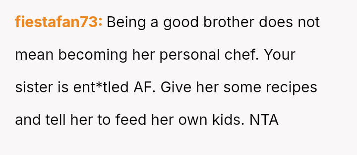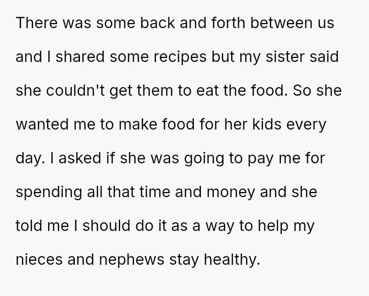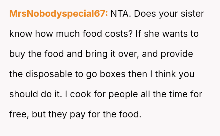 The central conflict stems from the sister viewing the OP's cooking as an unpaid, ongoing familial obligation rather than a service that was temporarily provided and compensated for.
