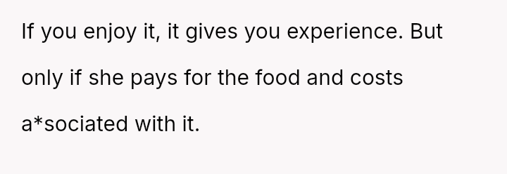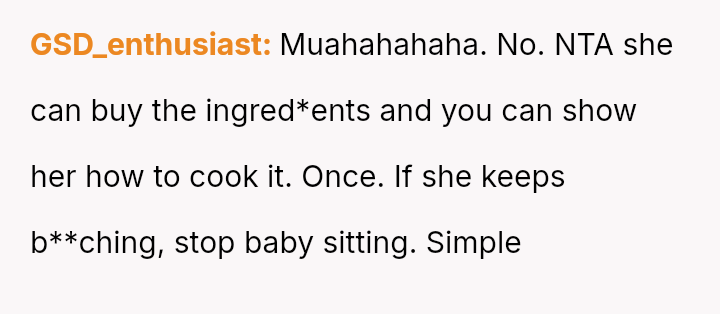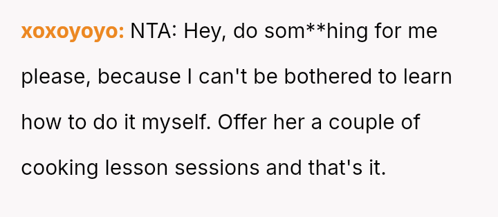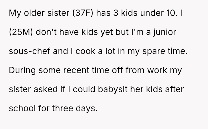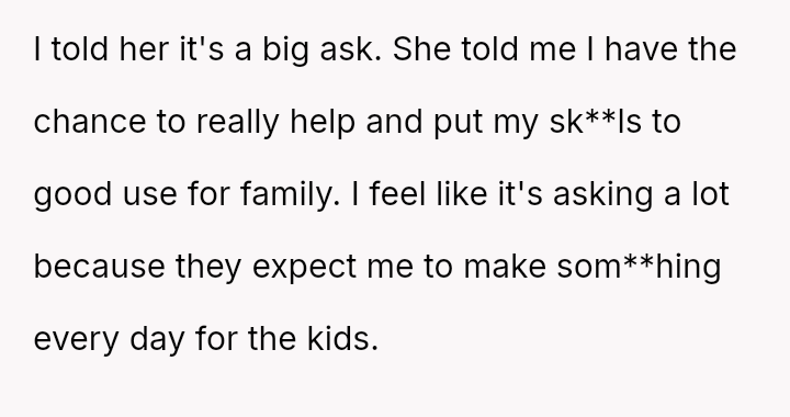 The original poster (OP) is caught between honoring his family role by helping his sister and maintaining appropriate boundaries regarding his time and culinary sk**ls.