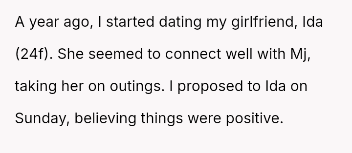 The original poster (OP) is facing a crisis in his engagement after his fiancée, Ida, publicly undermined his parental role in front of his five-year-old sister, Mj.