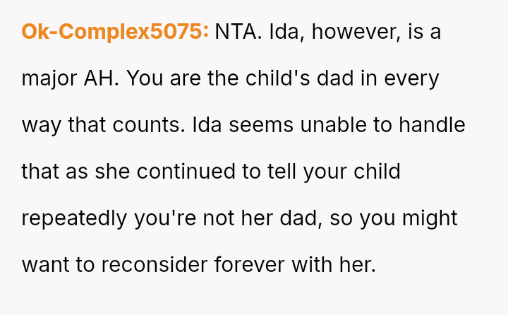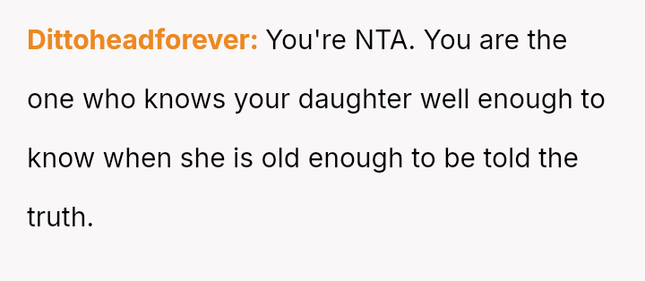 The core question remains whether Ida was justified in immediately clarifying the biological truth to a five-year-old, potentially fracturing the es**blished family unit, or if the OP was correct in prioritizing the child's emotional security and waiting for a more appropriate time to discuss the complex family history.