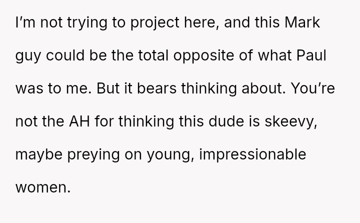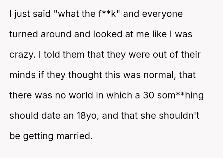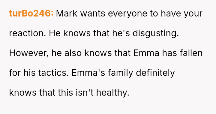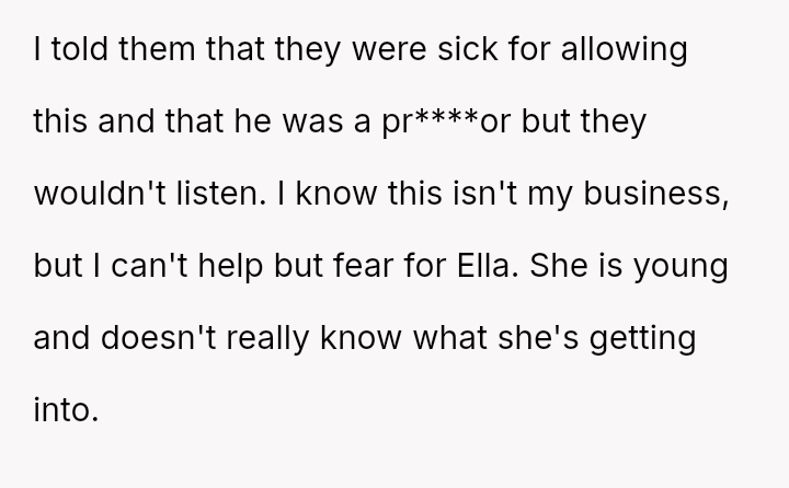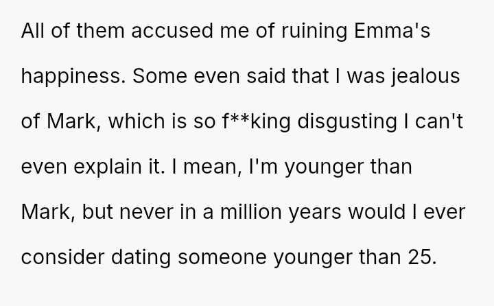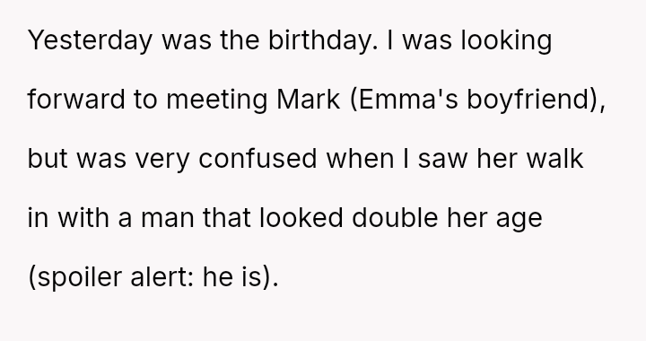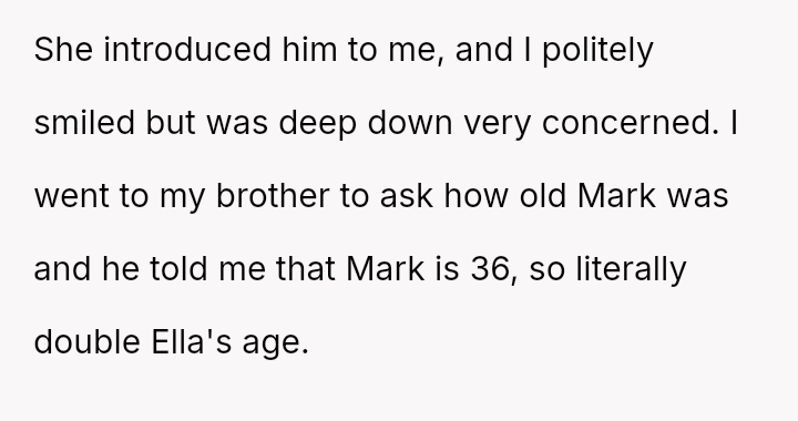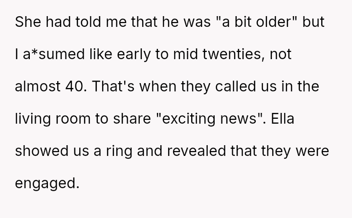 When Ella's boyfriend, Mark, was finally invited to a family event, the poster was shocked to discover Mark was 36, nearly double Ella's age. The situation escalated quickly when Ella announced they were engaged.