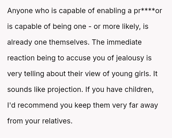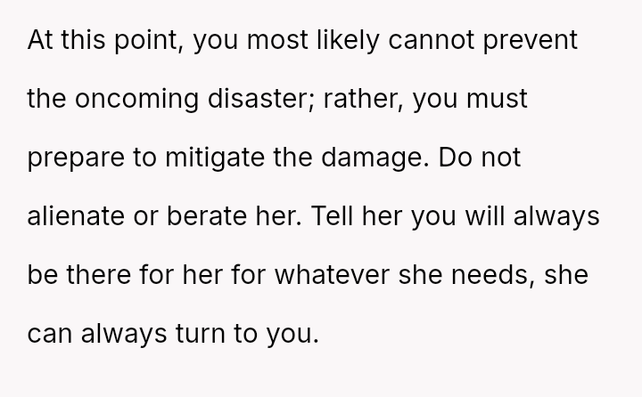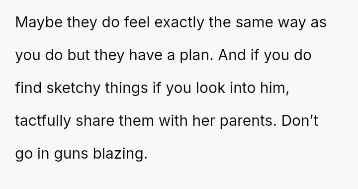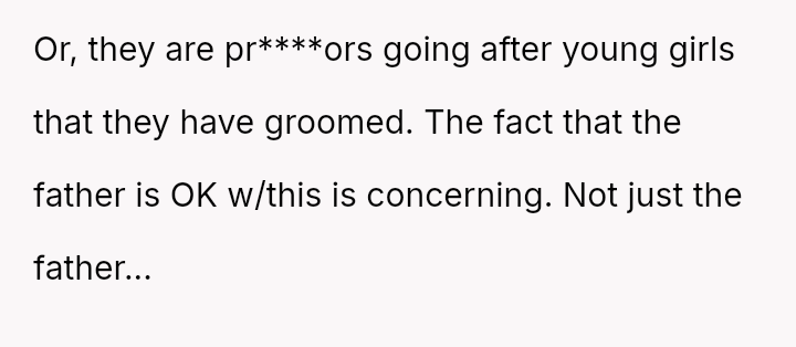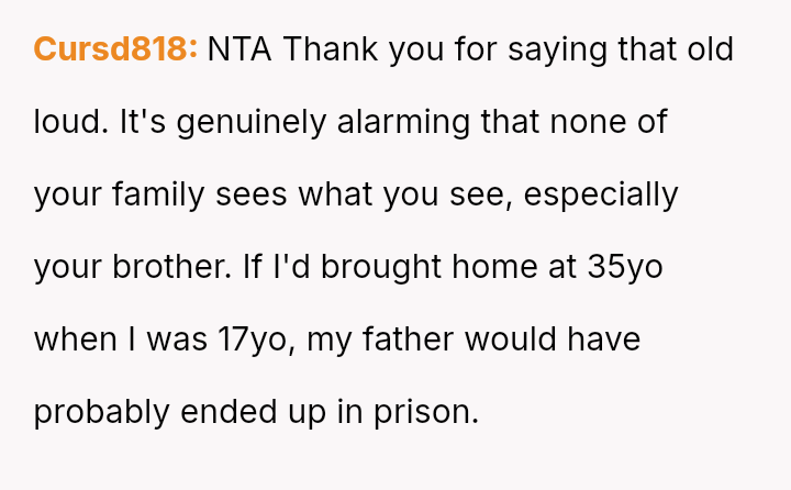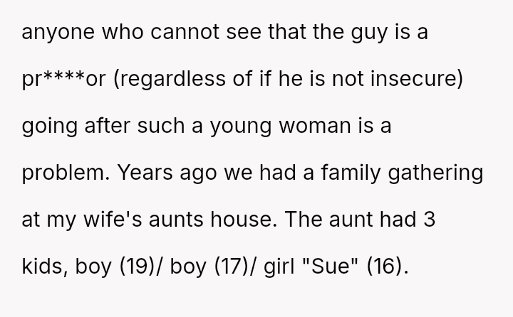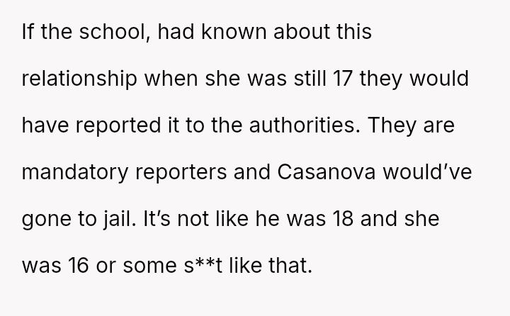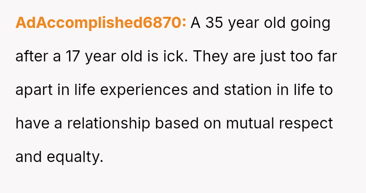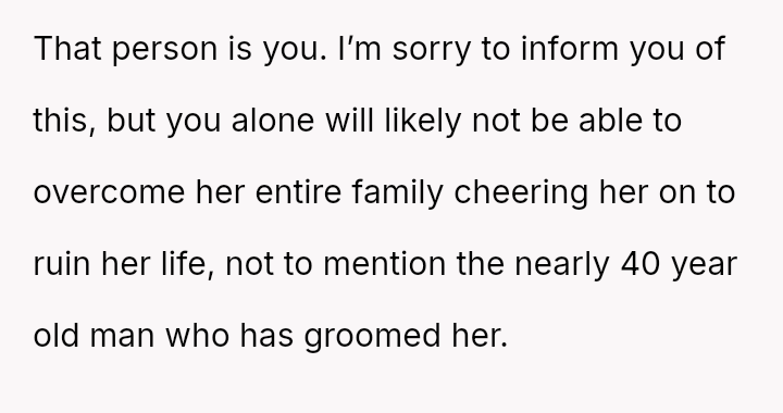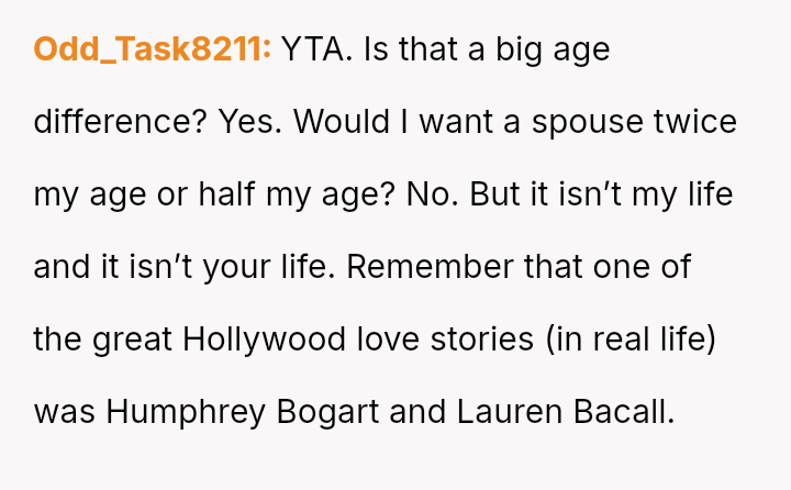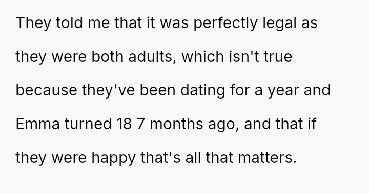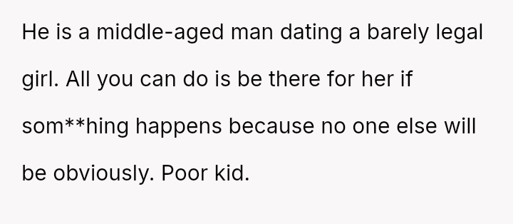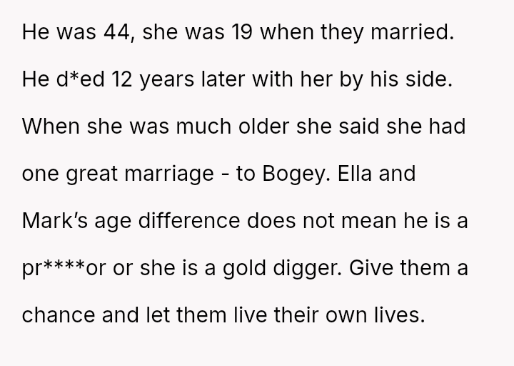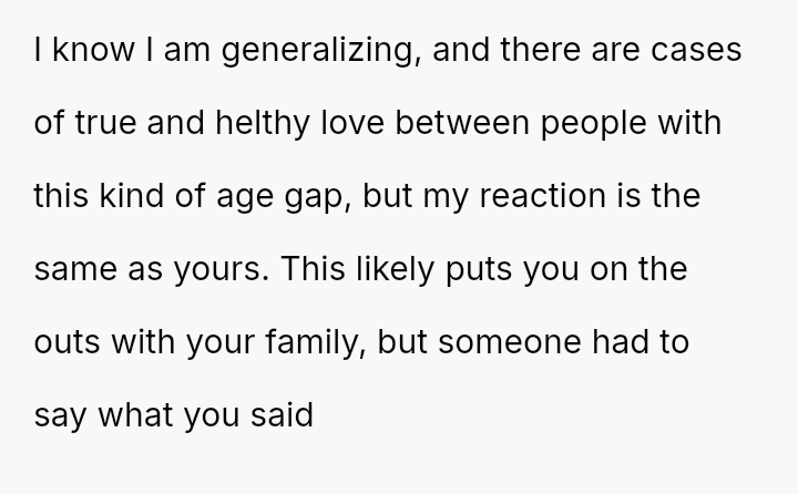 While the family focuses on the legality and the couple's happiness, the poster is focused on the potential for future harm and the perceived inappropriateness of the significant age difference.