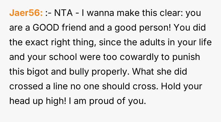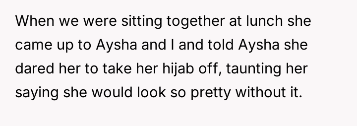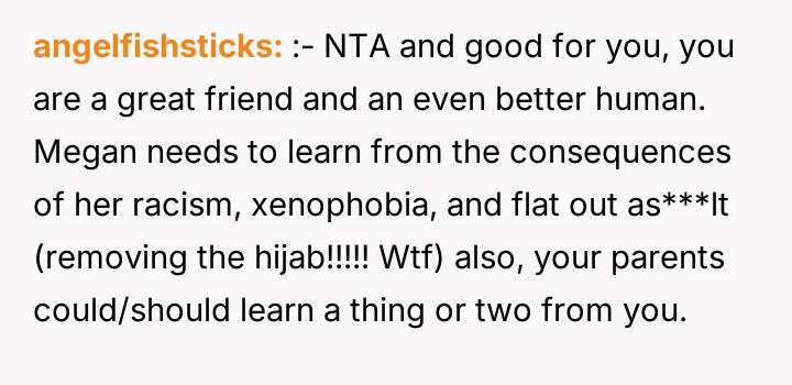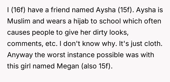 The original poster (OP) acted strongly to defend their friend, Aysha, against severe religious harassment, resulting in significant consequences for the aggressor, Megan. This defense, while supported by the OP's moral conviction, has caused a major social backlash against the OP from peers, and has created a disagreement with the OP's parents, who preferred non-involvement.