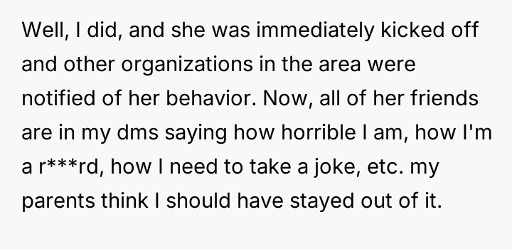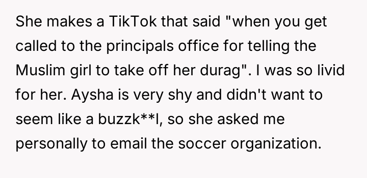As renowned researcher Dr. Brené Brown explains, “Boundaries are the distance at which I can love you and me simultaneously.” This situation highlights a severe breach of personal and social boundaries, where Megan's actions moved beyond simple teasing into harassment and physical aggression targeting Aysha's religious expression. The OP’s motivation appears rooted in a strong sense of loyalty and justice, recognizing that the school administration failed to adequately address the initial aggressive act. When formal systems fail to protect an individual from targeted harassment, bystanders often feel compelled to seek alternative avenues for accountability. Aysha’s reluctance to speak up herself (due to shyness and not wanting to be a 'buzzkill') placed the burden of advocacy entirely on the OP, who then chose the most impactful route available—contacting the external organization tied to Megan's social standing. The OP's action was appropriate in seeking accountability for severe harassment that included physical contact and mockery, especially after the initial school report yielded insufficient results. However, the ensuing social conflict could have been partially mitigated by first discussing the plan with Aysha again, even if Aysha had previously authorized the email. Moving forward, when dealing with social conflicts that have external consequences, the OP should aim to clearly establish the desired outcome with the victim first, ensuring that the corrective action aligns with the long-term well-being and comfort level of the person they are trying to protect.