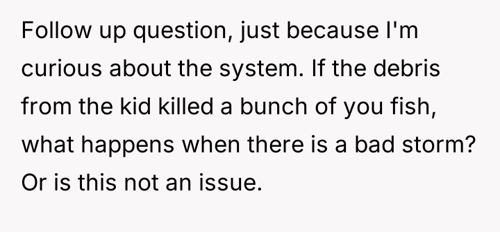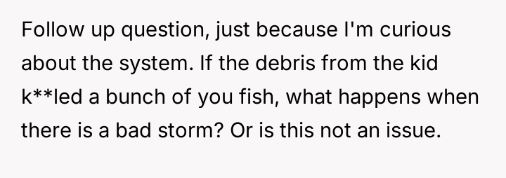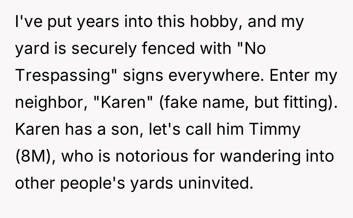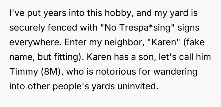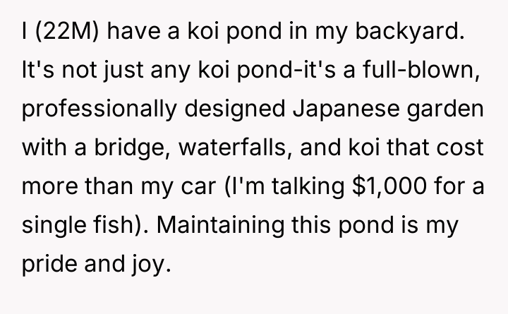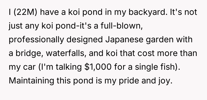 The OP maintains a costly and elaborate Japanese-style koi pond in their securely fenced backyard, viewing it as a source of great pride. The conflict centers around the neighbor's eight-year-old son, Timmy, who has a history of entering the OP's private property without permission.