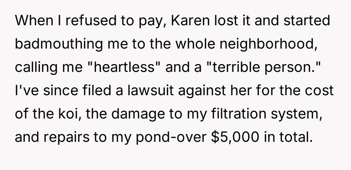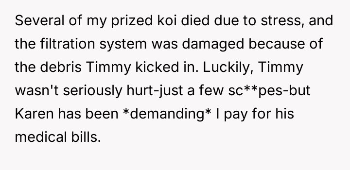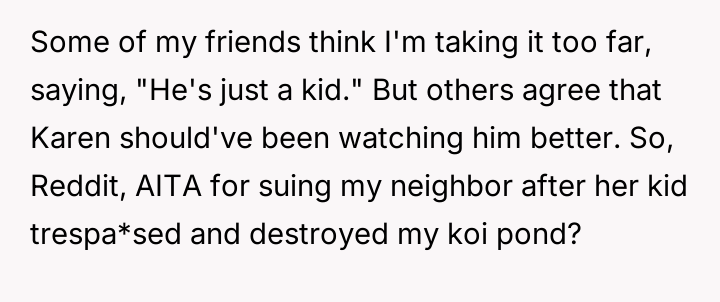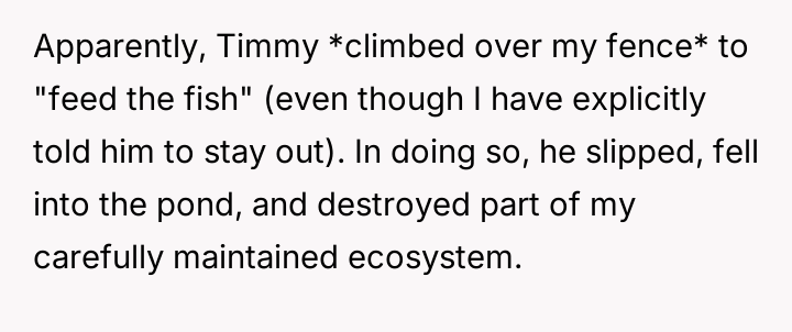 AITA for suing my neighbor after their kid trespa*sed and fell into my koi pond?