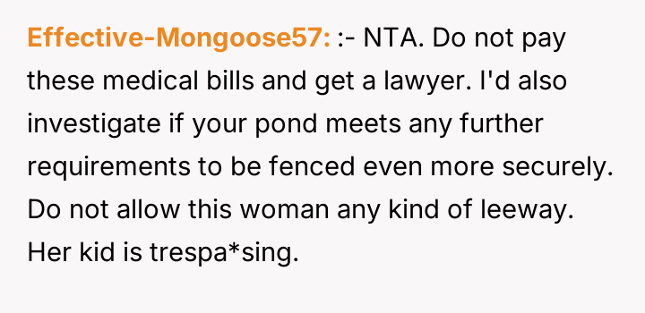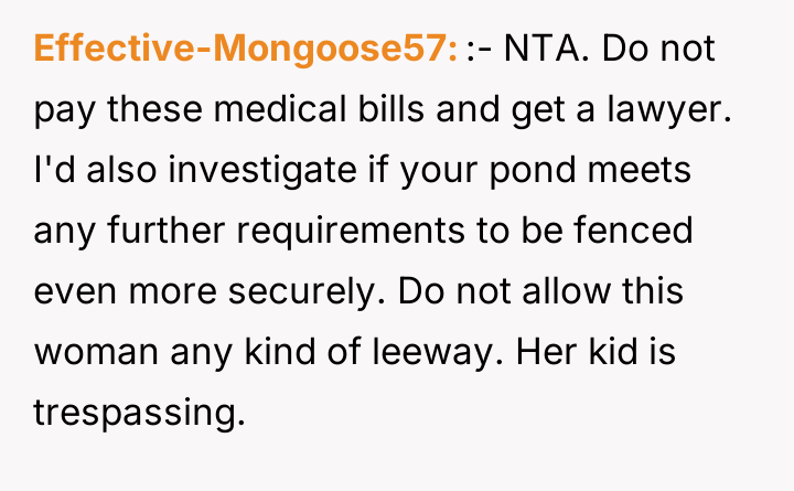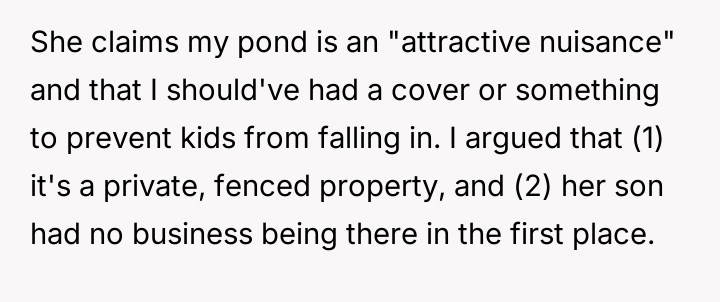The OP clearly established boundaries by installing a secure fence and 'No Trespassing' signs, and they had explicitly warned the neighbor about Timmy previously. Karen’s defense that the pond constitutes an 'attractive nuisance' is generally weakened when the trespasser must actively bypass security measures (climbing a fence) to access the alleged nuisance. Her reaction, demanding the OP pay for medical bills after her son damaged the OP’s property while trespassing, attempts to deflect accountability for both poor supervision and the initial illegal entry.