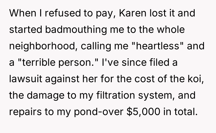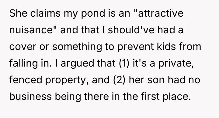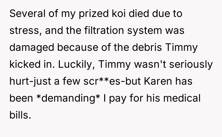 AITA for suing my neighbor after their kid trespassed and fell into my koi pond?