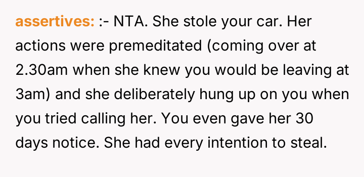 Given the escalation to criminal charges, was the OP justified in reporting the car stolen when the deadline passed and the sister took the vehicle anyway, or did this response constitute an overreaction given the family relationship? Should the OP have pursued lesser consequences, such as involving parents earlier or filing a police report only after the deadline, rather than escalating directly to theft charges?
