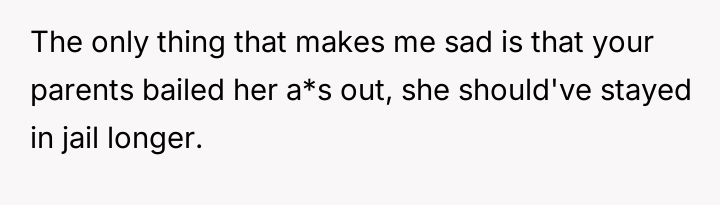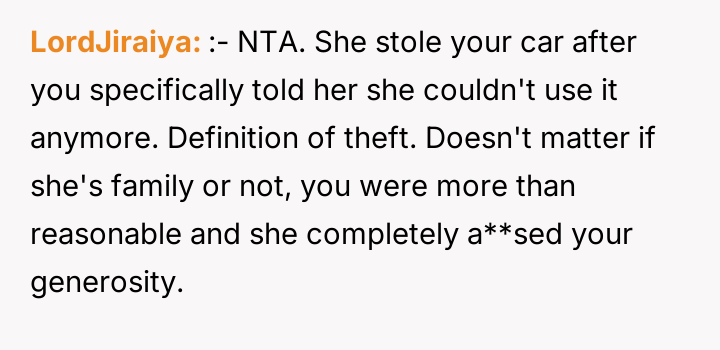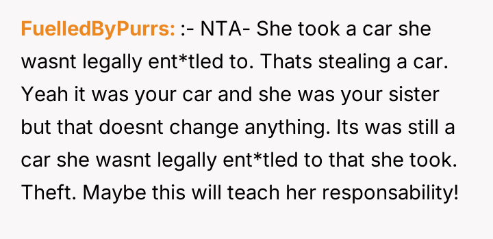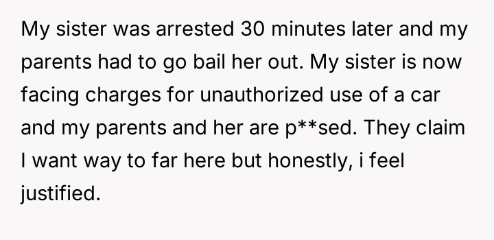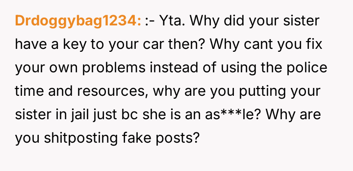 The original poster (OP) felt completely taken advantage of due to their sister's ongoing misuse of the borrowed car, leading to an extreme reaction when the agreed-upon deadline was ignored. The central conflict lies between the OP's need to enforce personal boundaries after repeated abuse of generosity and the sister's expectation of continued free access, resulting in serious legal consequences.