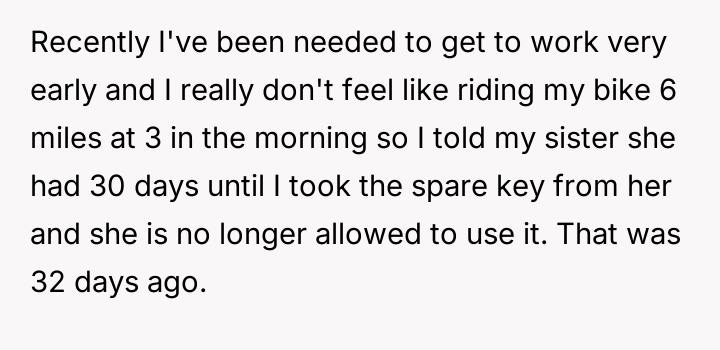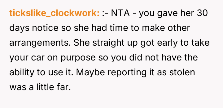 As renowned researcher Dr. Brené Brown explains, 'Boundaries are the distance at which I can love you and me simultaneously.' This situation illustrates a complete breakdown of healthy relational boundaries, where the OP extended immense generosity that was then systematically exploited by the sister. The OP's initial motivation was kind, offering help when the sister needed transport. However, the sister treated this temporary loan as an entitlement, failing to repair her own vehicle, refusing financial assistance, and disregarding the terms of use (fuel, specific times). This behavior suggests a lack of respect for the OP's property and needs. When the OP set a firm boundary (30 days notice), the sister deliberately violated it by taking the car before the deadline expired. The OP's decision to report the car stolen, while legally extreme, was a final, desperate action to enforce a boundary that had been repeatedly ignored, prioritizing self-respect and necessity (early work shifts) over maintaining immediate familial peace. While the OP's actions achieved the immediate goal of stopping the abuse of the car, reporting it stolen created disproportionate legal trouble for the sister, which understandably angered the parents. A more constructive approach might have involved a documented, final warning stating that failure to return the car by the deadline would result in immediate repossession (e.g., changing the locks or retrieving the spare key immediately after the deadline passed), rather than involving law enforcement for unauthorized use. This allows the OP to reclaim their property without immediately inviting criminal charges.