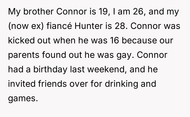 The original poster (OP) is currently experiencing intense emotional pain and is acting decisively against their brother, Connor, whom they previously cared for deeply, by evicting him. The central conflict stems from a drunken game where Connor revealed the OP's decade-old, regretted teenage mistake of cheating, which directly triggered the fiancé's severe, pre-existing trauma related to infidelity, leading to an immediate breakup.