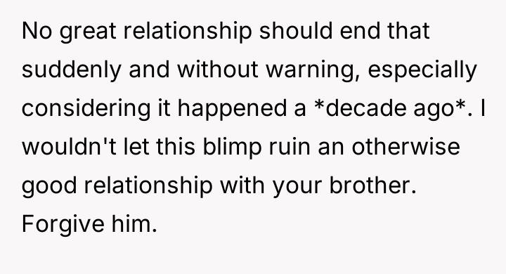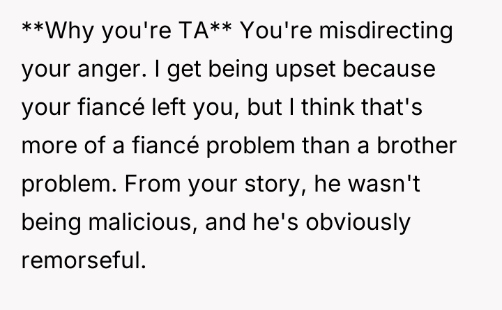 The OP's action of eviction, while perhaps appropriate in terms of immediately creating emotional distance from the source of the immediate pain (Connor), is likely an overcorrection relative to the long-term relationship. A more constructive approach would involve temporarily separating while processing the fiancé's departure, but delaying the final eviction notice until emotions settle. This would allow for a mediated conversation where the OP can express the depth of their pain without making irreversible decisions about their brother's housing.
