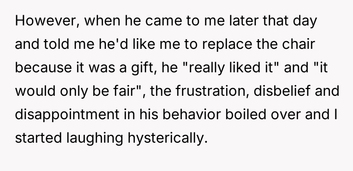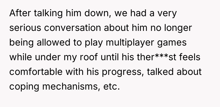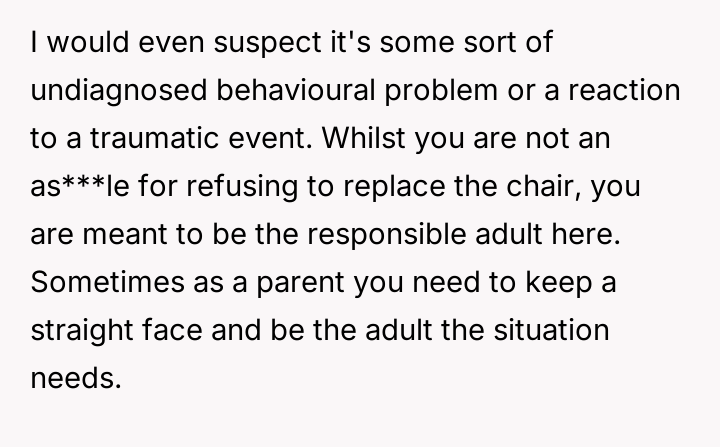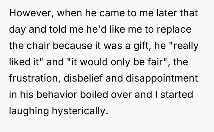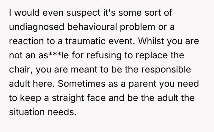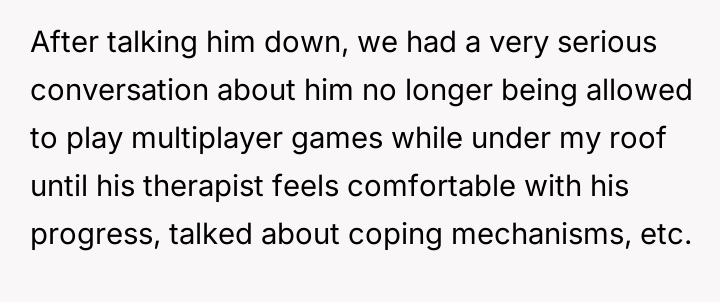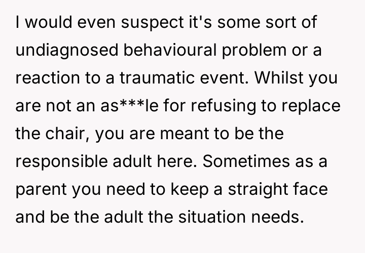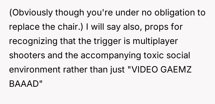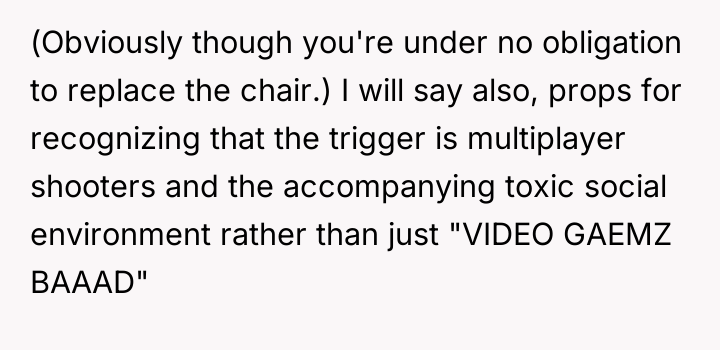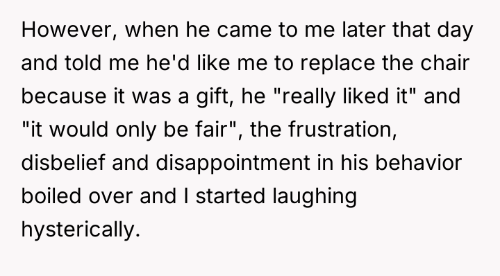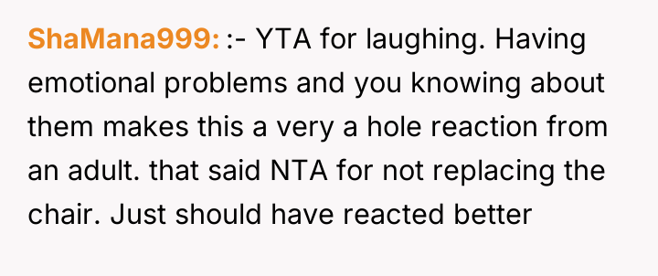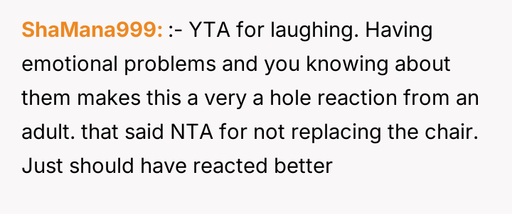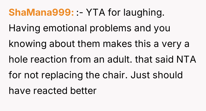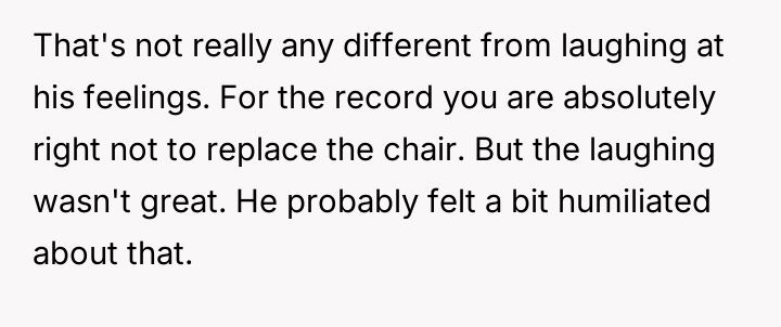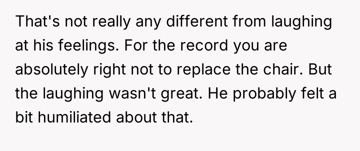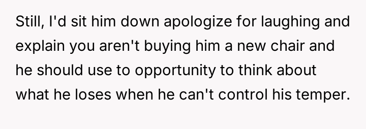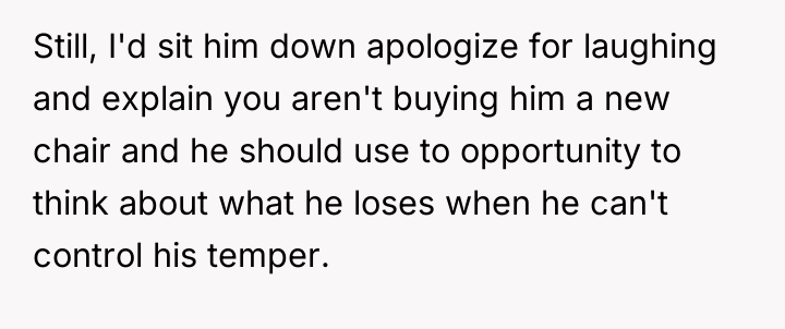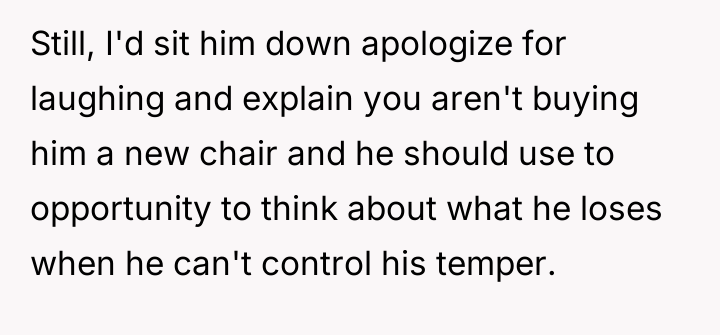 As renowned researcher Dr. Brené Brown explains, “Boundaries are the distance at which I can love you and me simultaneously.” In this scenario, the parent correctly established a necessary boundary by removing access to the triggering activity (multiplayer gaming) and implementing grounding following the destruction of property. However, the subsequent interaction regarding the replacement of the broken chair introduced a new boundary violation: the son attempted to shift the financial and accountability burden for his impulsive action onto the parent. The OP's reaction—hysterical laughter—is highly indicative of a stress response, possibly a form of emotional flooding or a momentary break when confronted with the sheer absurdity of the son's entitlement. While the son's expectation was objectively unreasonable for a teenager, responding with uncontrollable laughter invalidates the seriousness of the underlying anger issue the family is trying to address in therapy. This reaction, regardless of the OP's intent (laughing at the absurdity, not the feeling), effectively communicated dismissal and mockery to the son, causing him to feel minimized and further infuriated, thus sabotaging the prior serious conversation. The OP's disciplinary action regarding the grounding and gaming restriction was appropriate and necessary. However, the reaction needs correction. Professionally, the OP should apologize specifically for the loss of control (the laughter), framing it as a personal stress reaction, while firmly reiterating that the consequence (no replacement chair) stands because accountability for property damage is non-negotiable. In future similar situations, the OP should practice a structured 'pause'—walking away immediately when feeling overwhelmed—to prevent such uncontrolled emotional displays.