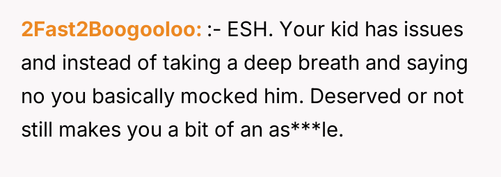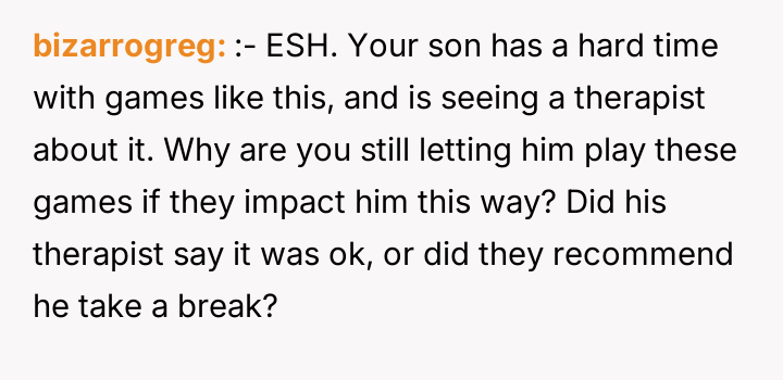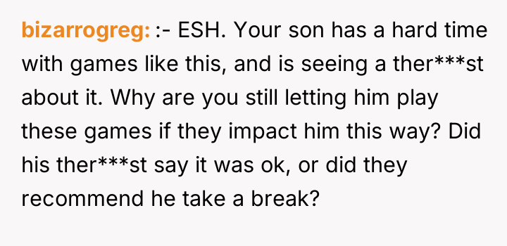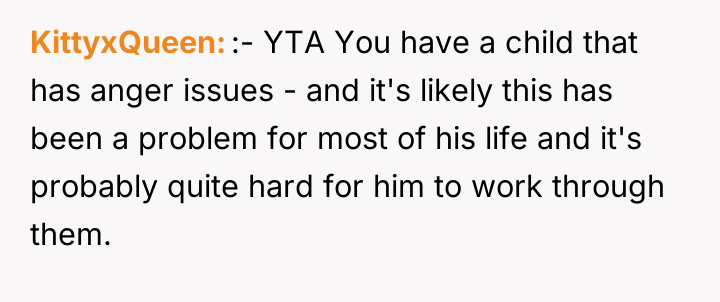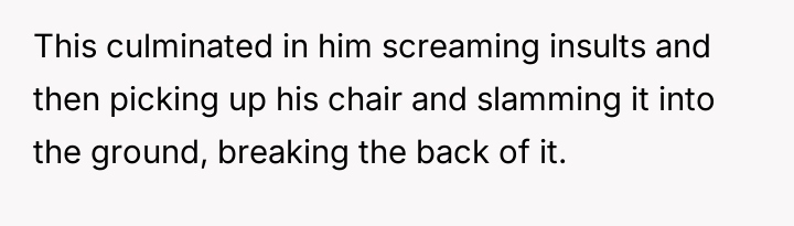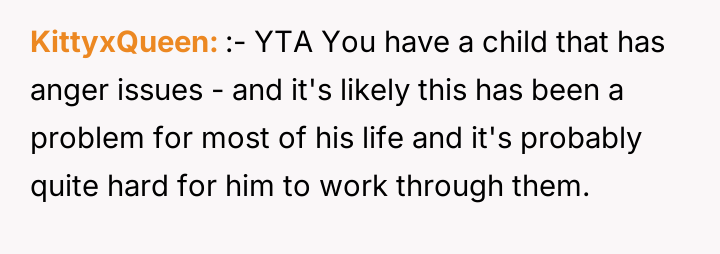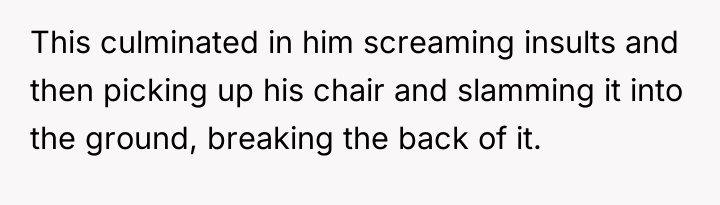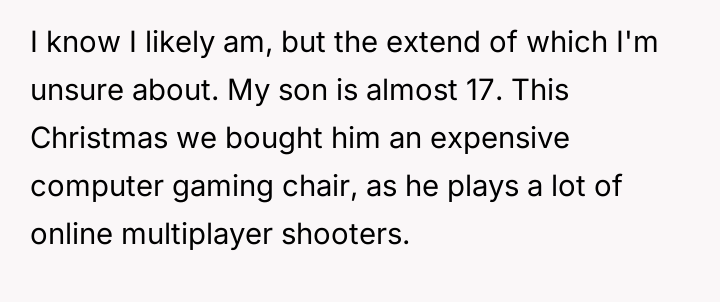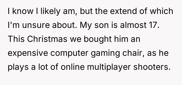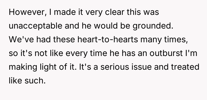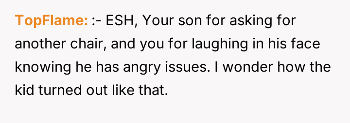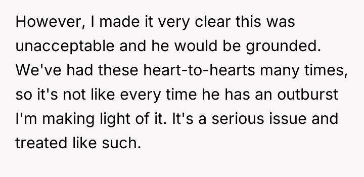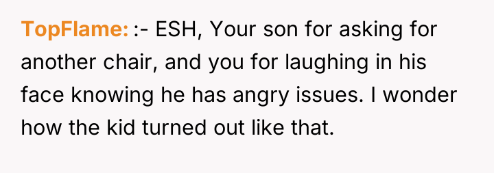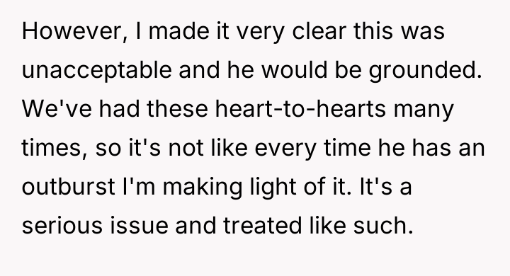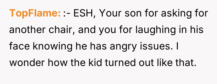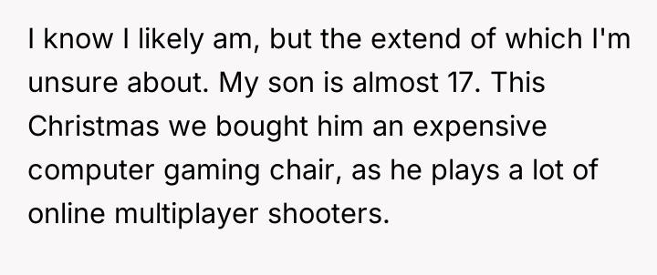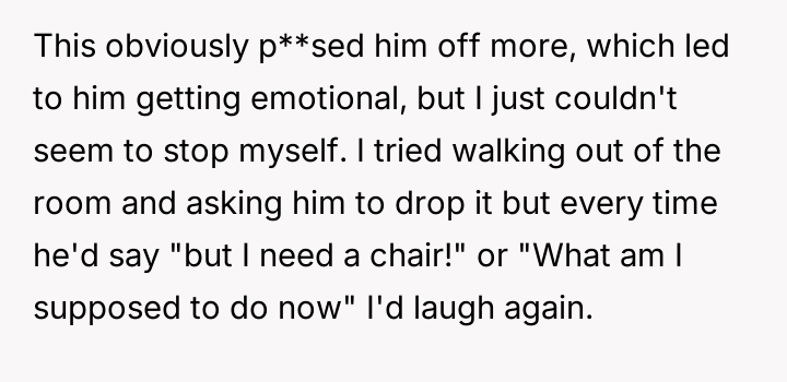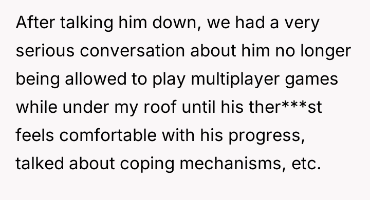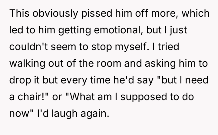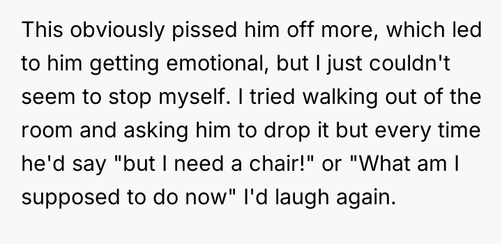 As renowned researcher Dr. Brené Brown explains, “Boundaries are the distance at which I can love you and me simultaneously.” In this scenario, the parent correctly established a necessary boundary by removing access to the triggering activity (multiplayer gaming) and implementing grounding following the destruction of property. However, the subsequent interaction regarding the replacement of the broken chair introduced a new boundary violation: the son attempted to shift the financial and accountability burden for his impulsive action onto the parent. The OP's reaction—hysterical laughter—is highly indicative of a stress response, possibly a form of emotional flooding or a momentary break when confronted with the sheer absurdity of the son's entitlement. While the son's expectation was objectively unreasonable for a teenager, responding with uncontrollable laughter invalidates the seriousness of the underlying anger issue the family is trying to address in therapy. This reaction, regardless of the OP's intent (laughing at the absurdity, not the feeling), effectively communicated dismissal and mockery to the son, causing him to feel minimized and further infuriated, thus sabotaging the prior serious conversation. The OP's disciplinary action regarding the grounding and gaming restriction was appropriate and necessary. However, the reaction needs correction. Professionally, the OP should apologize specifically for the loss of control (the laughter), framing it as a personal stress reaction, while firmly reiterating that the consequence (no replacement chair) stands because accountability for property damage is non-negotiable. In future similar situations, the OP should practice a structured 'pause'—walking away immediately when feeling overwhelmed—to prevent such uncontrolled emotional displays.