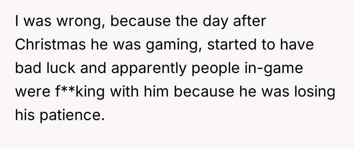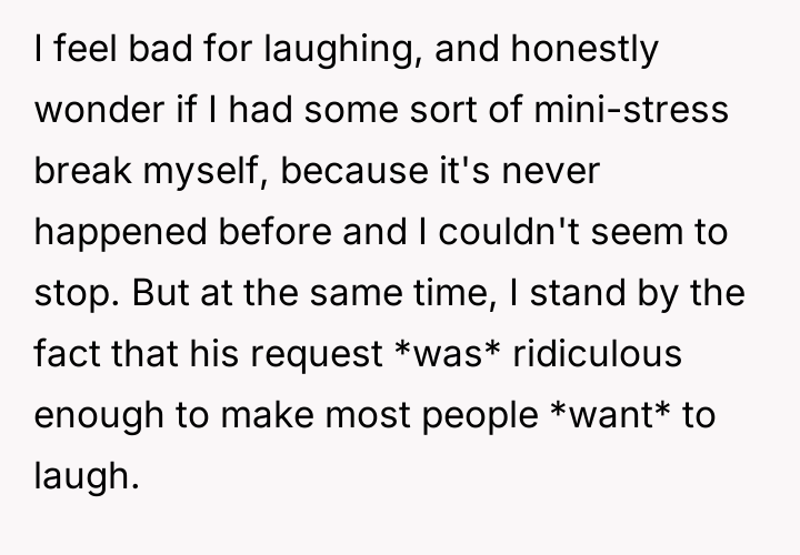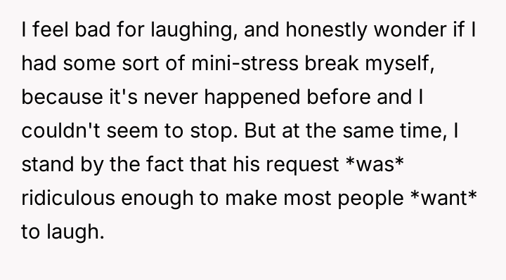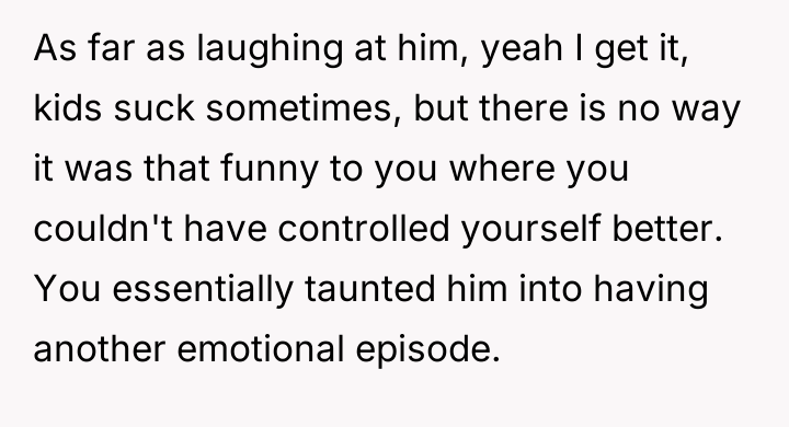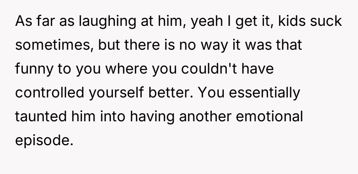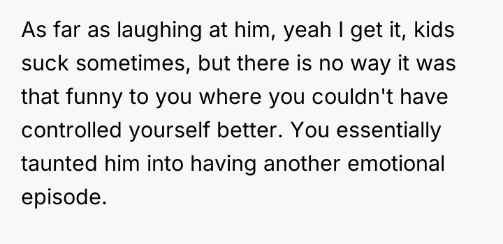 The original poster (OP) is facing a significant conflict stemming from their reaction to their son's unreasonable demand following a destructive outburst. While the OP correctly identified the son's behavior—destroying a Christmas gift in anger—as unacceptable and implemented consequences, their response of hysterical laughter when the son demanded a replacement gift was a failure in emotional regulation that further escalated the situation and caused the son to feel slighted.